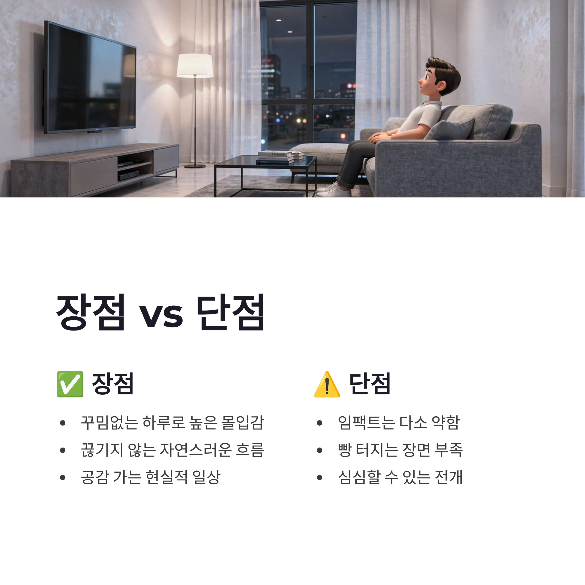 2026년 예능 트렌드가 확실히 바뀌고 있다는 게 느껴졌습니다. 예전처럼 웃음 몰아치기보다, 생활 정보 + 사람 관찰 쪽으로요. 나 혼자 산다 배나라는 그 흐름에 딱 맞아떨어졌어요. 장점은 몰입감. 꾸밈없는 하루라서 흐름이 끊기질 않더라구요. 반면 단점이라면… 솔직히 말해 임팩트는 약합니다. 빵 터지는 장면을 기대하면 심심할 수도 있어요 ㅠㅠ 그래도 장기적으로 보면 이런 멤버가 한 명쯤 있어야 프로그램 밸런스가 맞는 느낌이었슴다.