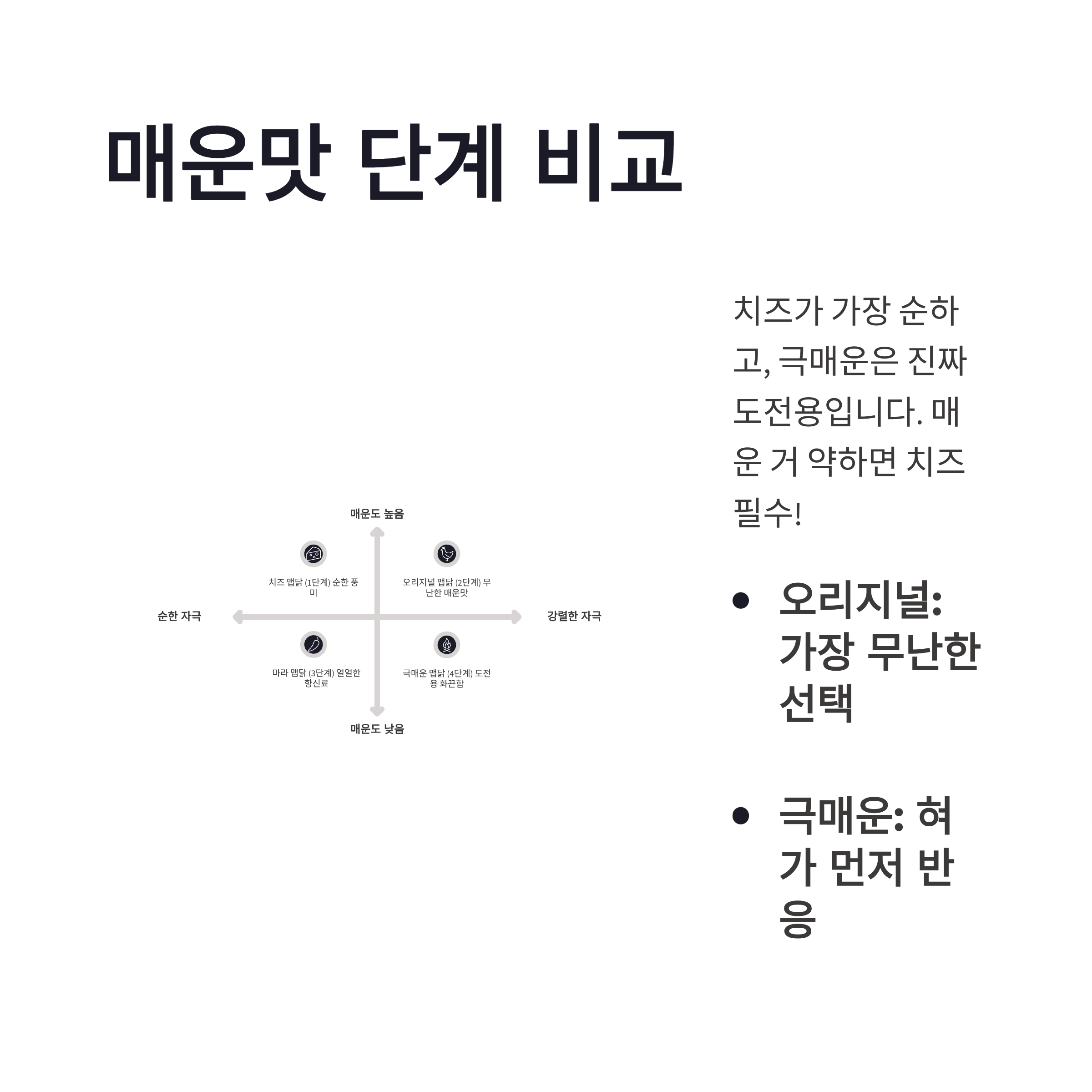 | 맵닭 치즈 | 매운맛+치즈 완충 | 🌶 |