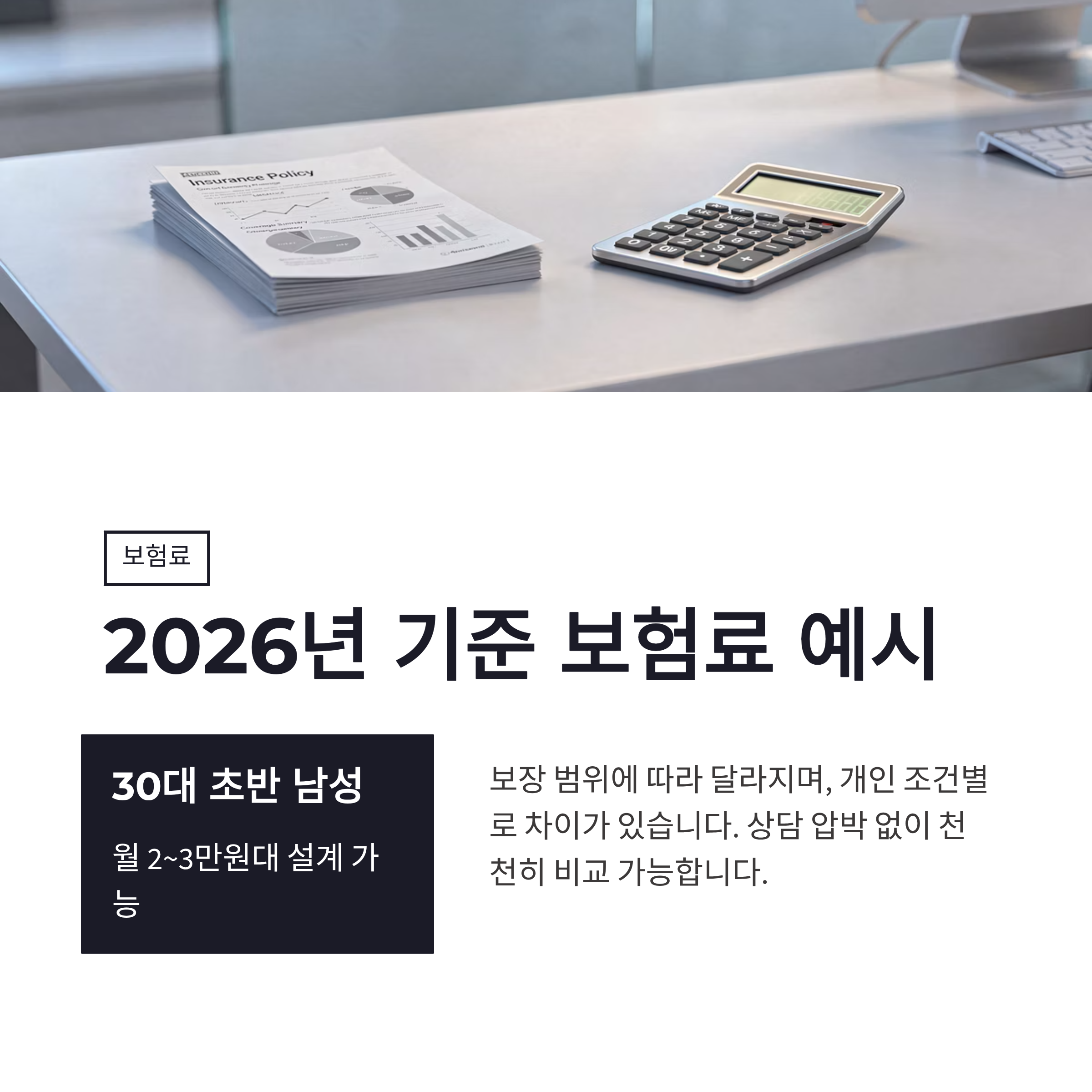 2026년 기준 보험료는 가입 연령 30대 초반 남성 기준 월 2~3만원대 설계 예시가 많았어요(보장 범위에 따라 달라짐). 물론 이건 개인 조건에 따라 다르니까 참고용입니다.