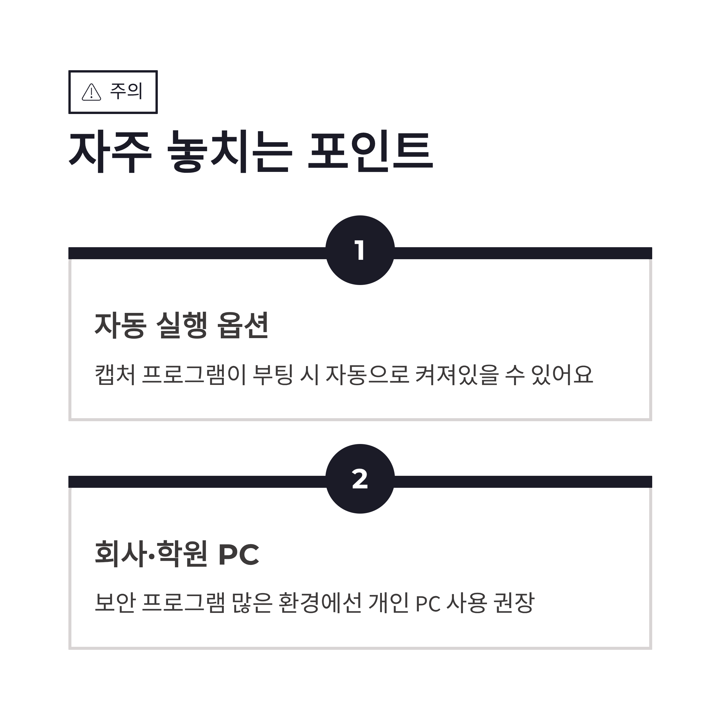 여기서 제일 많이 놓치는 게 있어요. 바로 캡처 프로그램 자동 실행 옵션이에요. 실행 안 한 줄 알았는데 부팅할 때 같이 켜져 있던 거죠. 또 하나는 회사 PC나 학원 PC처럼 보안 프로그램이 많은 환경이에요. 이 경우 메가스터디 오류코드 1002가 반복되면 개인 PC에서 듣는 게 훨씬 편했습니다. 참고로 메가스터디 강의는 메가스터디에서 제공하는 전용 플레이어가 보안에 민감한 편이라, 다른 인강보다 더 자주 걸리는 느낌도 있었구요.
