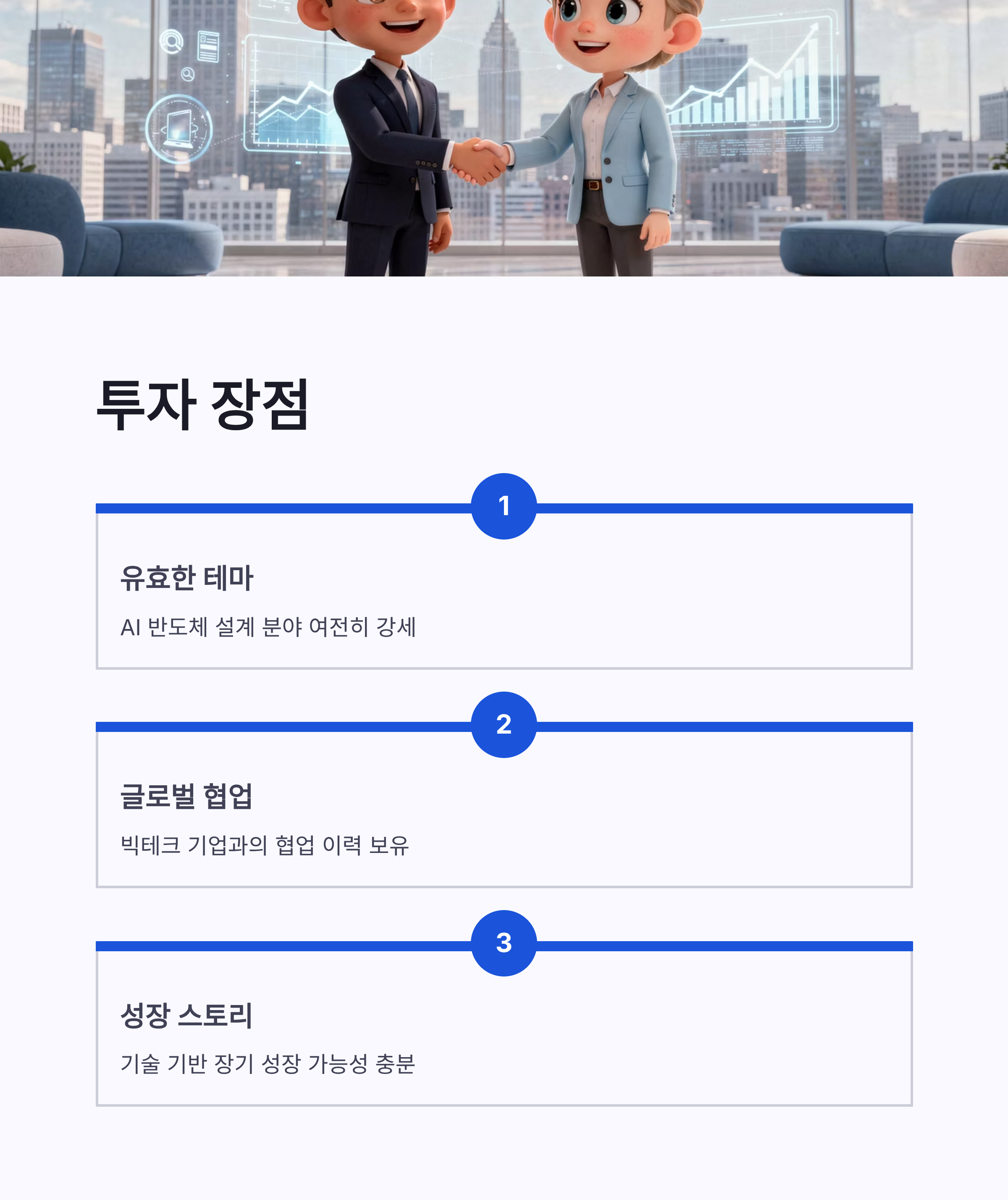 장점부터 보면, AI 반도체 설계라는 테마 자체가 여전히 유효하고, 글로벌 빅테크와의 협업 이력도 투자 포인트예요. 기술 기반 기업이라 장기 성장 스토리는 충분해 보이구요.