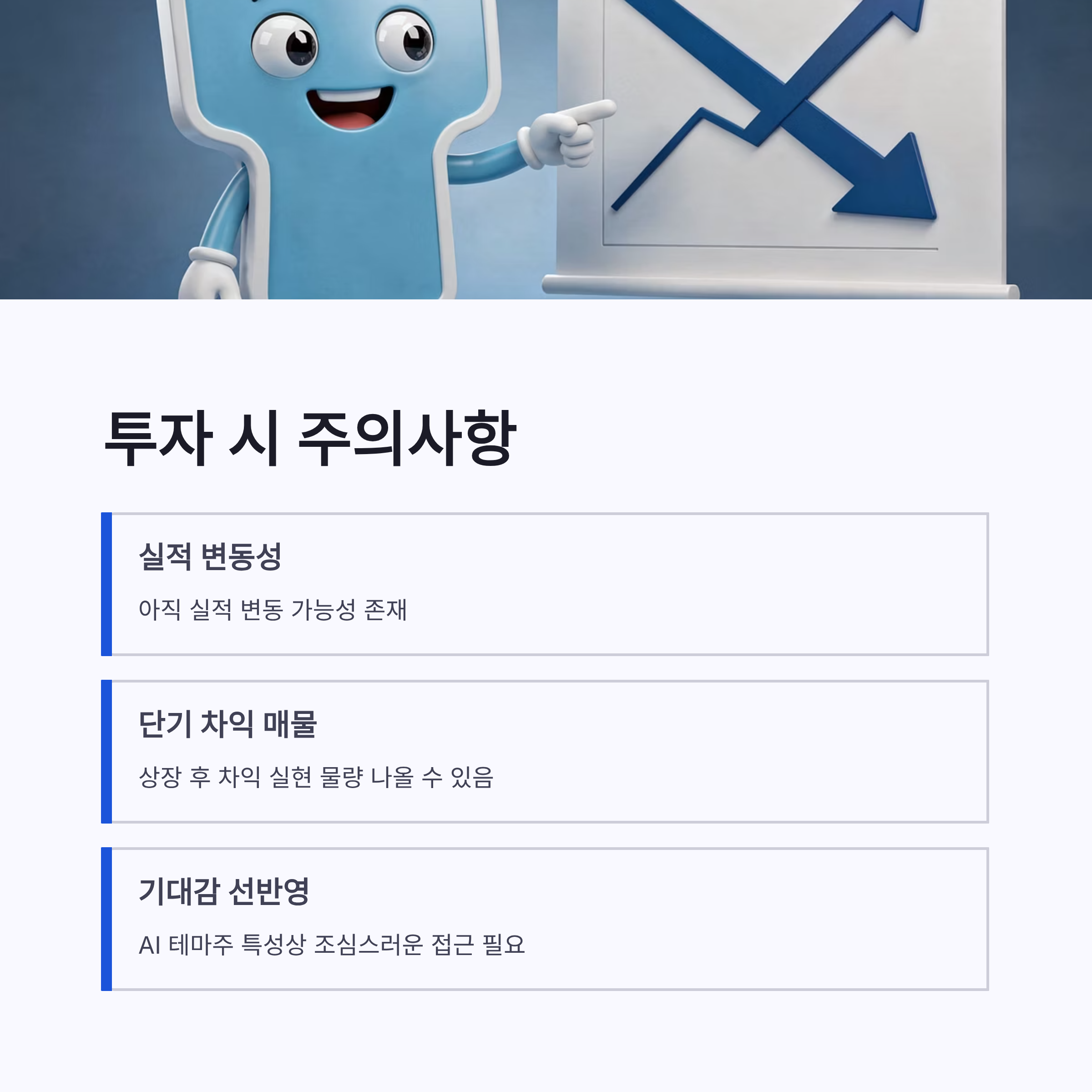 반대로 단점도 있어요. 아직 실적 변동성이 있고, 상장 후 단기 차익 매물이 나올 가능성도 무시 못 해요. AI 테마주 특성상 기대감이 먼저 반영될 수 있다는 점은 조금 조심해야겠더라구요.