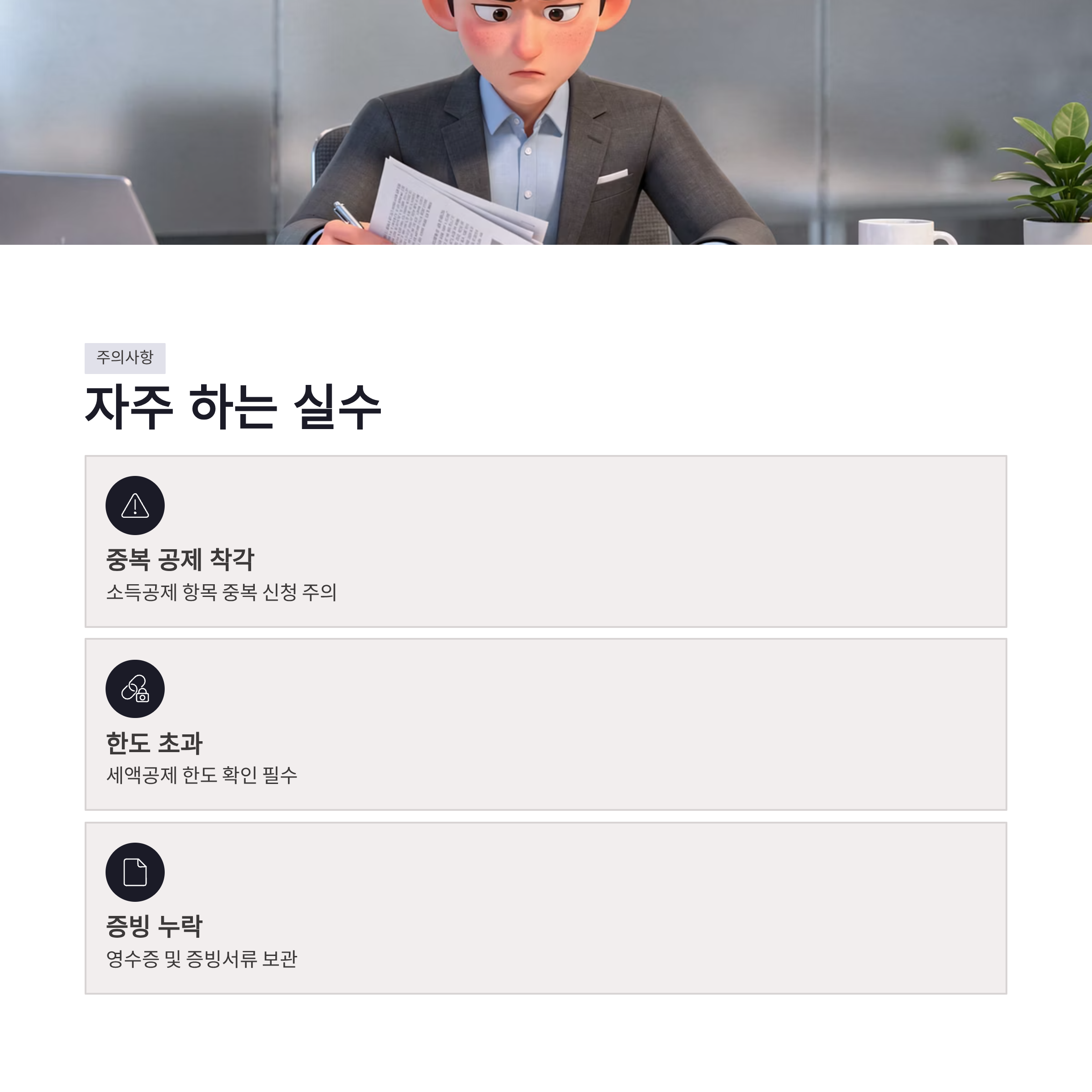 | 자주 하는 실수 | 중복 공제 착각 | 공제 한도 초과 |