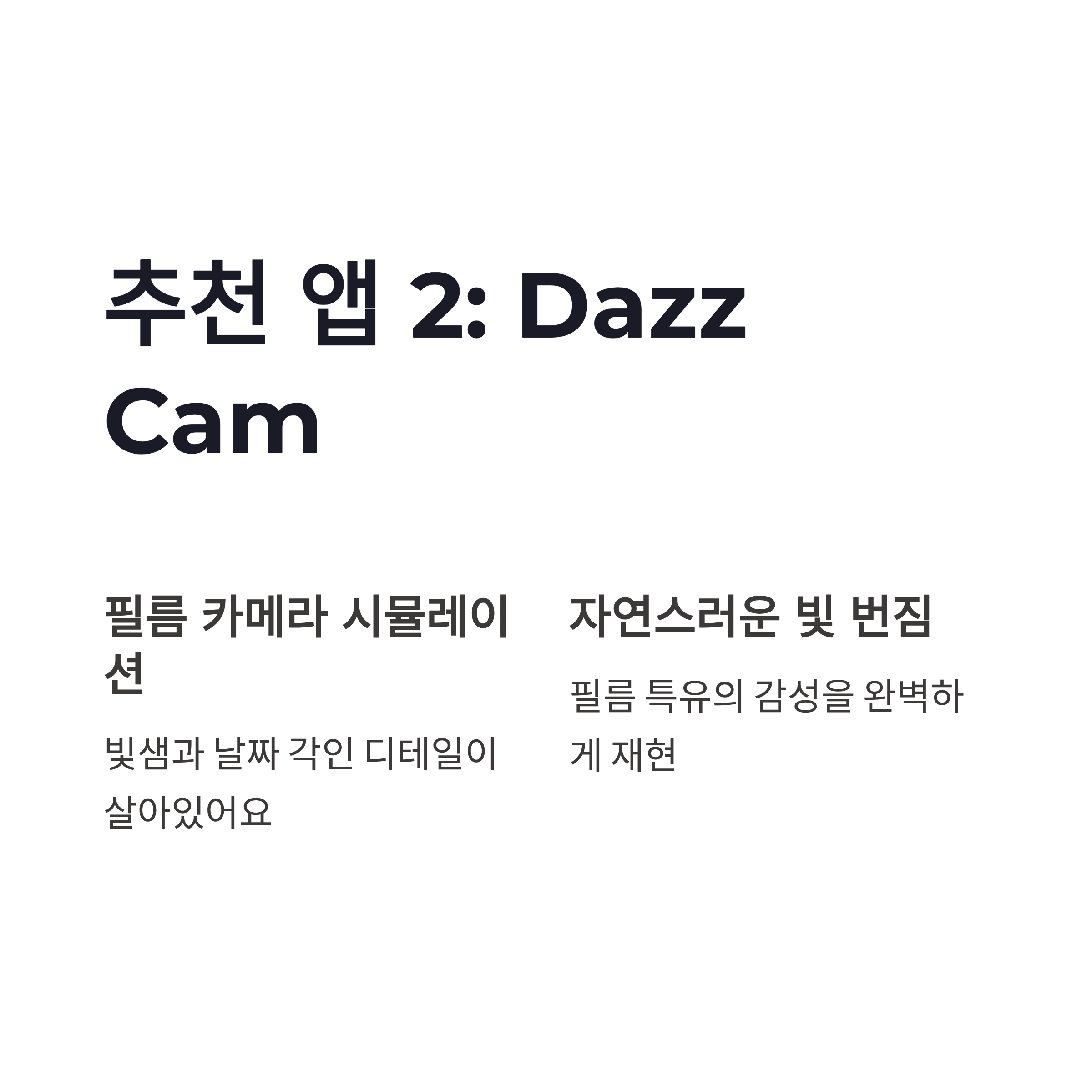 ProCCD는 CCD 디카 감성 좋아하는 분들한테 진짜 잘 맞고요, Dazz는 필름 특유의 빛 번짐이 꽤 자연스럽더라구요. 스마트폰 필름 감성 앱 여러 개 깔아서 상황별로 쓰는 것도 은근 재미있습니다.