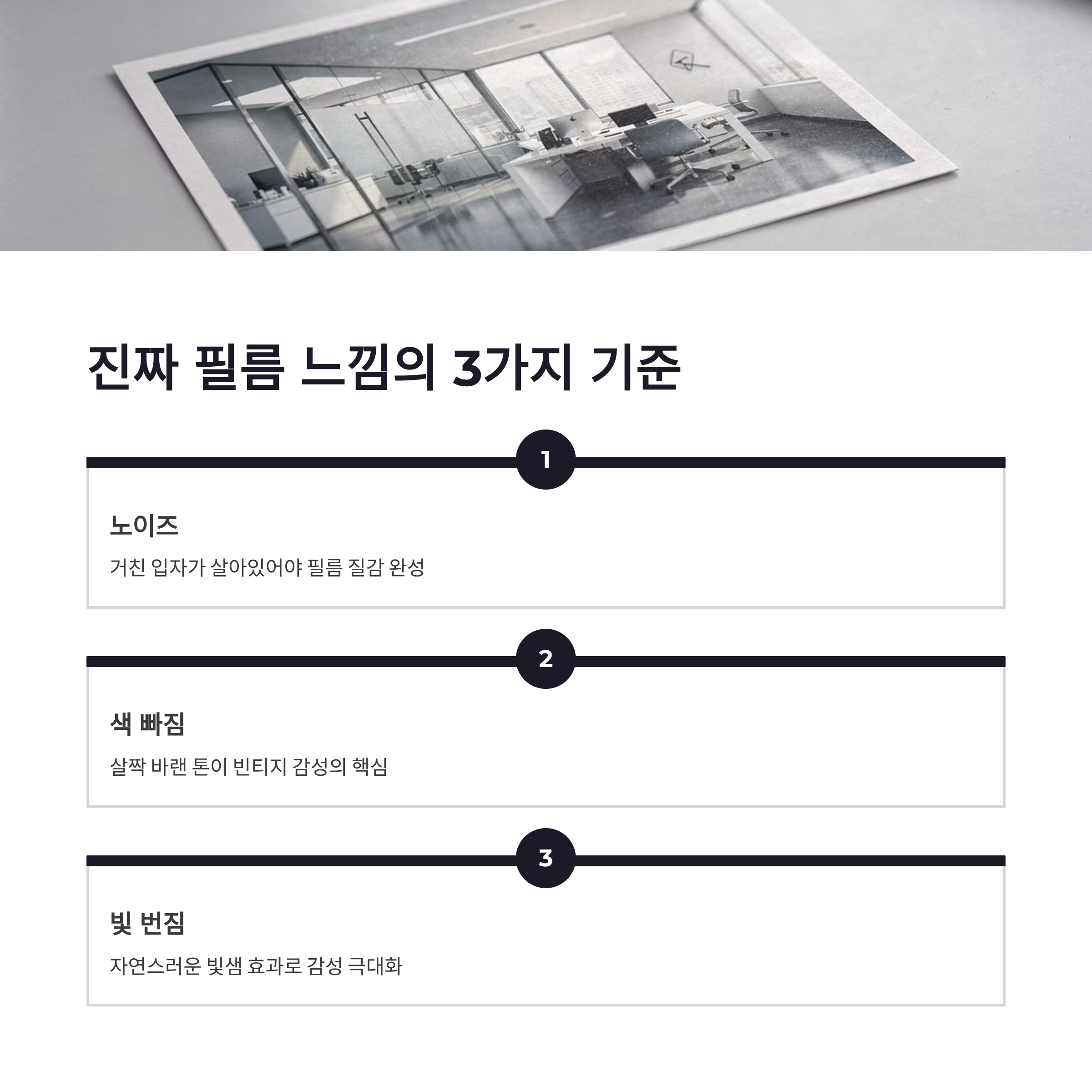 솔직히 말해서 스마트폰 필름 감성 앱이라고 다 같은 느낌은 아니더라구요. 제가 이것저것 써보면서 느낀 기준은 딱 세 가지였어요. 노이즈, 색 빠짐, 빛 번짐. 이게 자연스러워야 진짜 필름 느낌이 납니다. 특히 CCD 디카 감성은 색이 약간 쨍하면서도 거친 입자가 살아 있어야 하고, 필름 감성은 살짝 바랜 톤이 포인트더라구요. 요즘 앱들은 촬영할 때부터 효과가 들어가서 결과물이 더 자연스럽습니다. 찍고 나서 보정하는 방식이랑은 확실히 달라요. 스마트폰 필름 감성 앱 처음 쓰는 분들은 이 차이부터 느끼실 거예요.