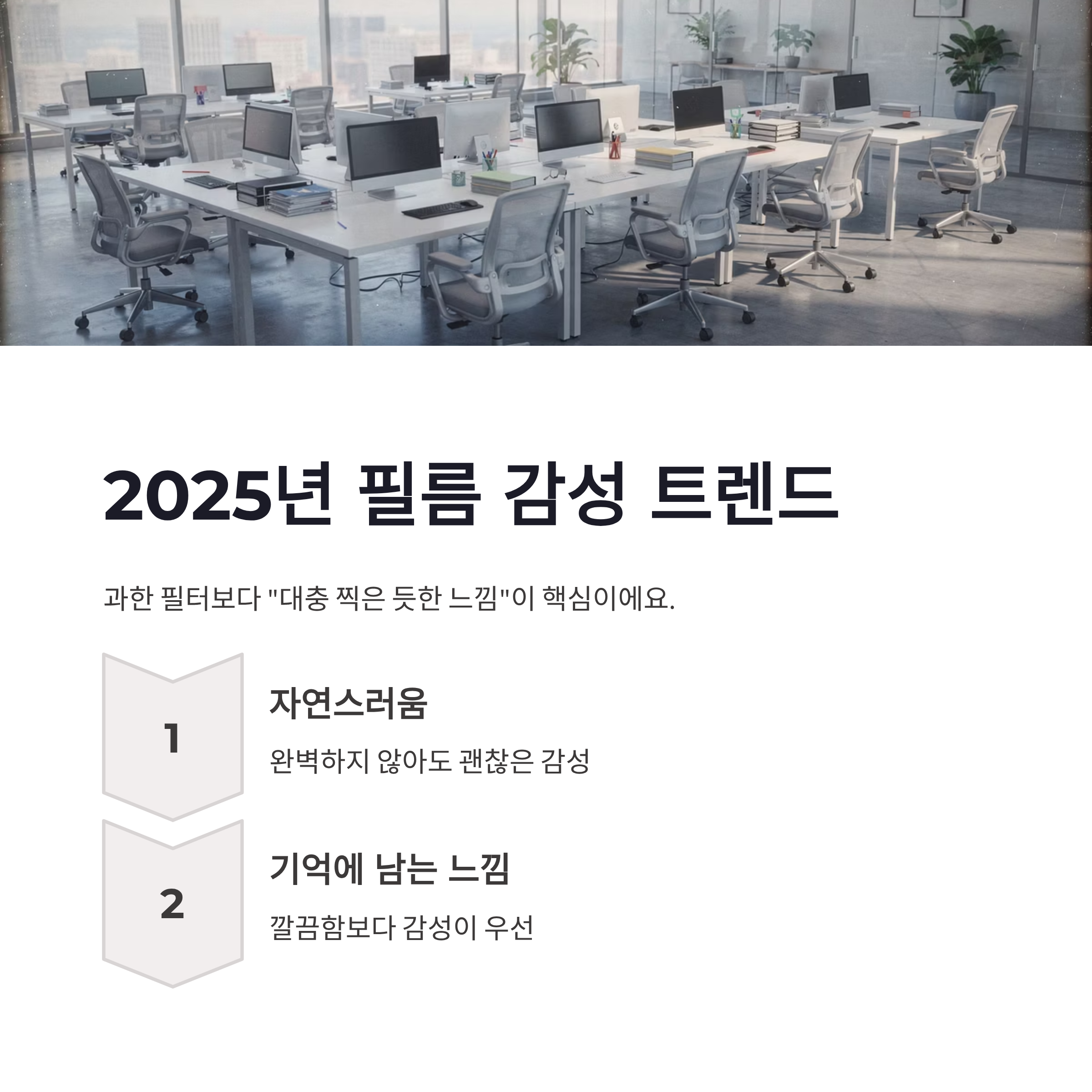 2025년 들어서 스마트폰 필름 감성 앱 트렌드가 확실히 바뀌었어요. 과한 필터보다는 “대충 찍은 듯한 느낌”을 더 중요하게 보더라구요. 장점은 감성이 진짜 살아난다는 거, 단점은 어두운 곳에서는 노이즈가 과해질 수 있다는 점… 이건 좀 호불호 갈리겠더라구요. 그래도 요즘 사진 SNS 보면 필름 감성 컷이 확실히 오래 보게 됩니다. 깔끔한 사진보다 기억에 남는 느낌이랄까… 그런 게 있어요.