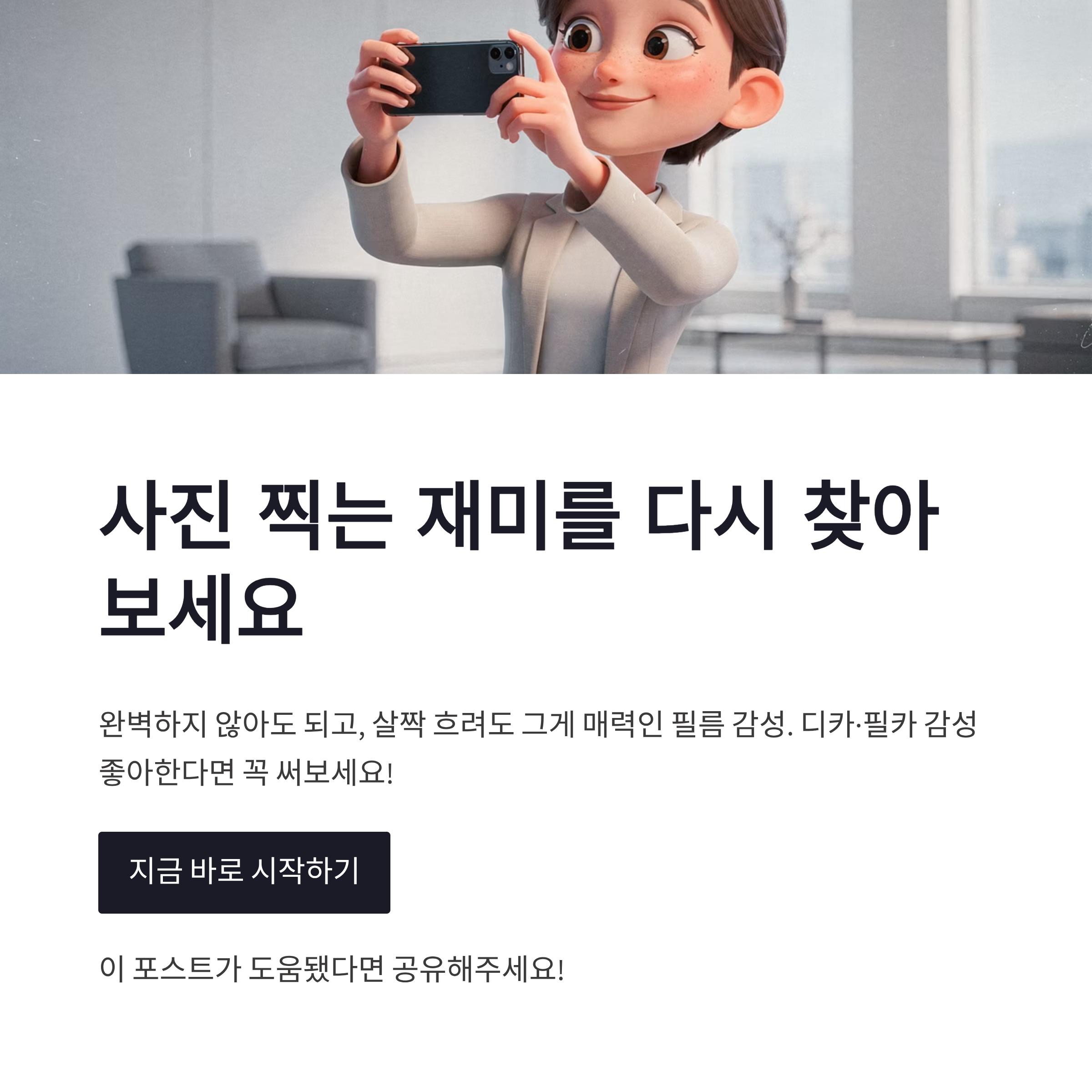 결론적으로 스마트폰 필름 감성 앱은 사진 찍는 재미를 다시 살려주는 도구 같아요. 완벽하지 않아도 되고, 살짝 흐려도 그게 매력인 느낌? 디카·필카 감성 좋아한다면 한 번쯤 꼭 써보시길 추천드려요. 저도 요즘은 일부러 필름 감성으로만 찍게 되더라구요 ㅎㅎ