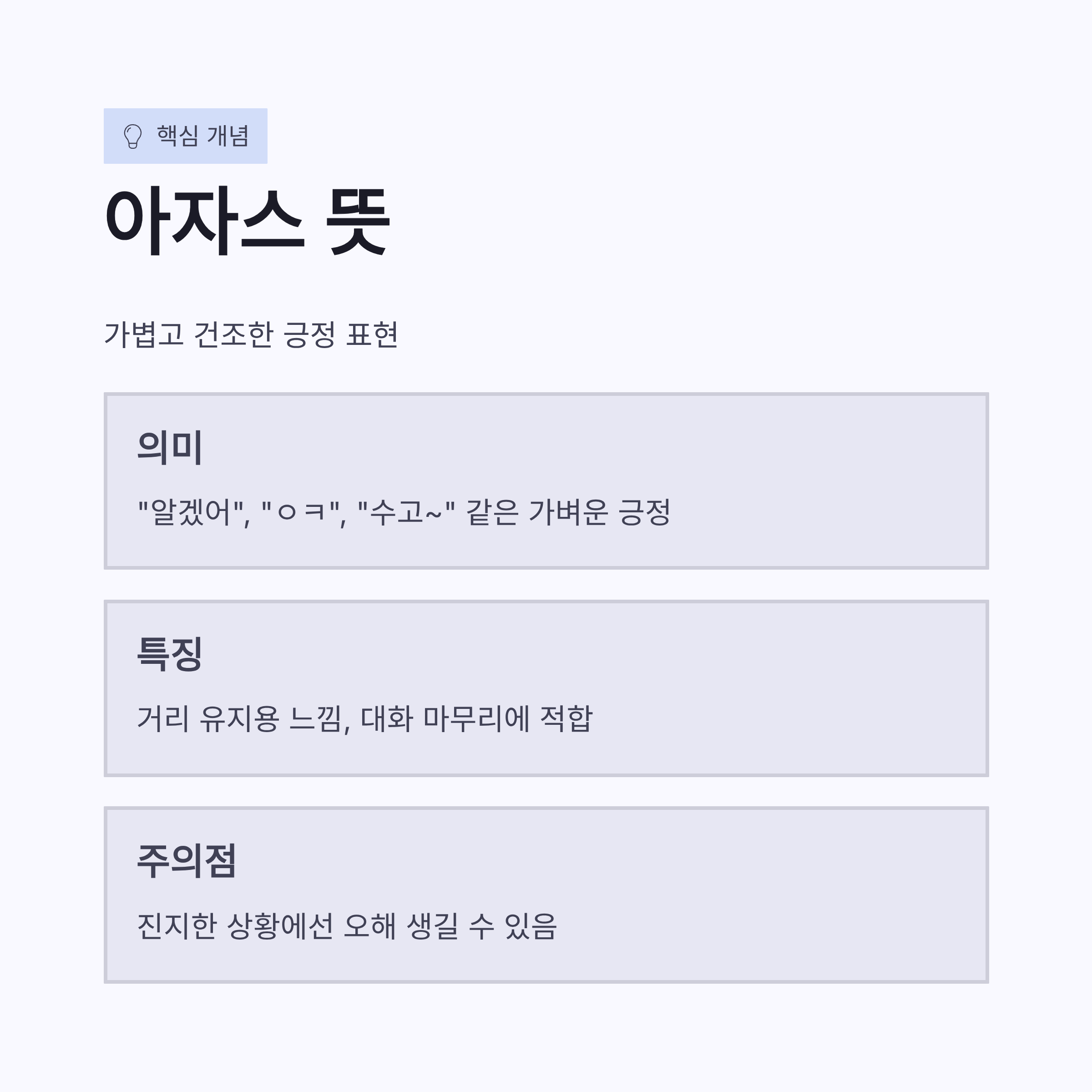 아자스는 얼핏 보면 인사 같기도 하고, 응원 같기도 한 말인데요. 실제로는 “알겠어”, “ㅇㅋ”, “수고~” 같은 가볍고 건조한 긍정에 가까워요. 예전처럼 “감사합니다!” 하기엔 좀 과하고, 그렇다고 무응답은 애매할 때 쓰기 딱 좋은 표현이더라구요. 제가 느끼기엔 살짝 거리 유지용 느낌? 그래서 아자스를 너무 진지한 상황에서 쓰면 오해 생길 수도 있어요. 그래도 친구들이랑 톡할 땐 편하긴 합니다ㅎㅎ 아자스 한 번 보내면 대화 마무리되는 그 느낌, 다들 아시죠?