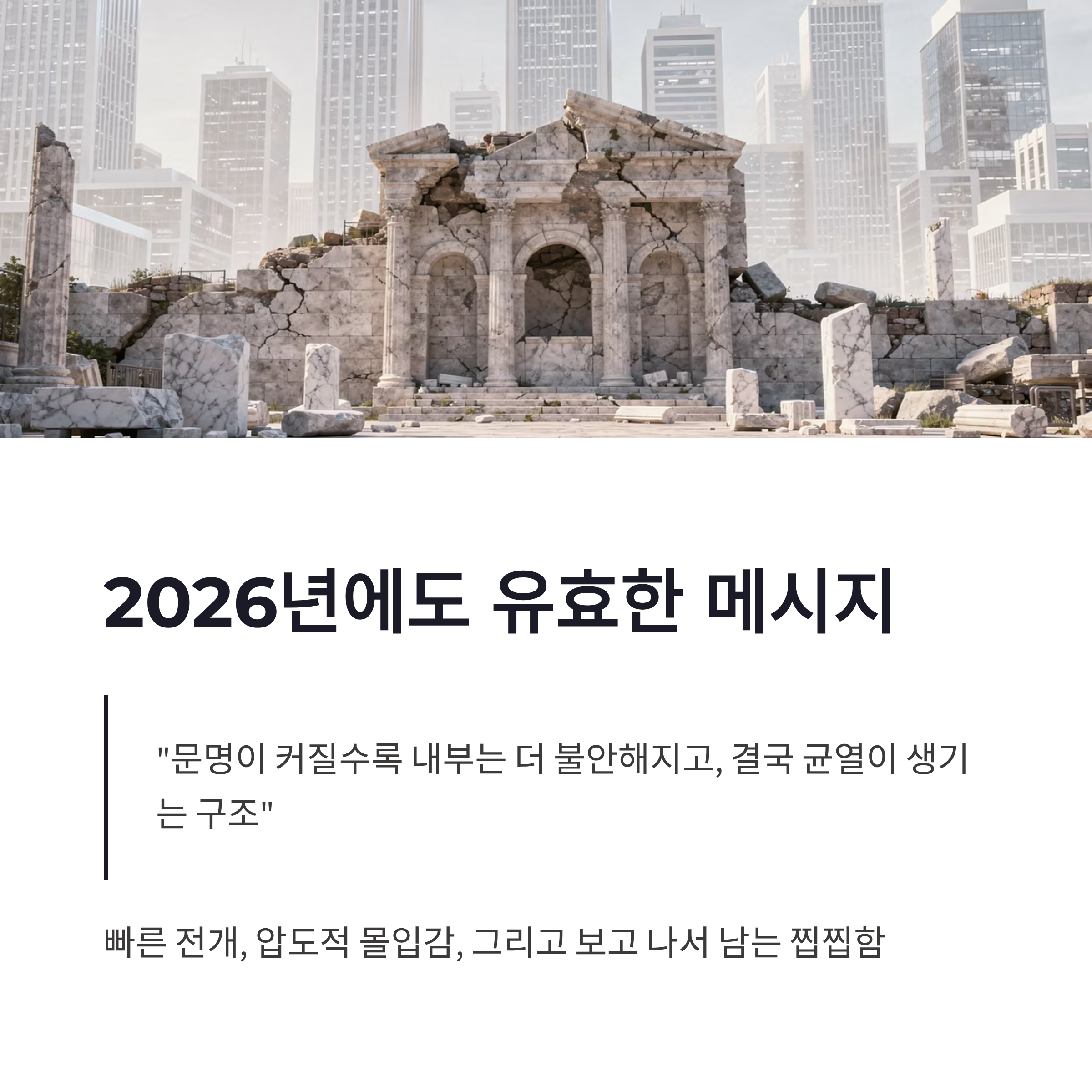 2026년 기준으로 봐도 아포칼립토는 여전히 세요. 빠른 전개, 압도적인 몰입감, 그리고 보고 나서 남는 찝찝함까지… 이게 쉽게 잊히는 영화는 아니더라구요. 저는 개인적으로 “요즘 세상도 비슷한 거 아냐?” 이런 생각이 계속 남았어요. 문명이 커질수록 내부는 더 불안해지고, 결국 균열이 생기는 구조 말이에요. 그냥 킬링타임용으로 보기엔 아까운 작품입니다. 아포칼립토 다시보기, 지금 타이밍에 한 번 해보셔도 후회는 없을 듯하네요 ㅎㅎ