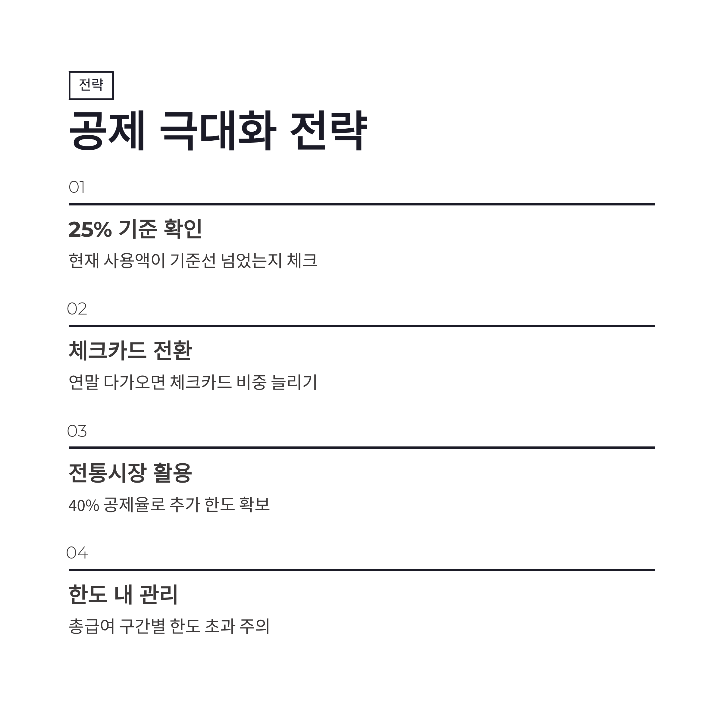 정리하면 이겁니다. ✔ 총급여 25% 초과 사용 ✔ 결제수단별 공제율 확인 ✔ 공제 한도 체크