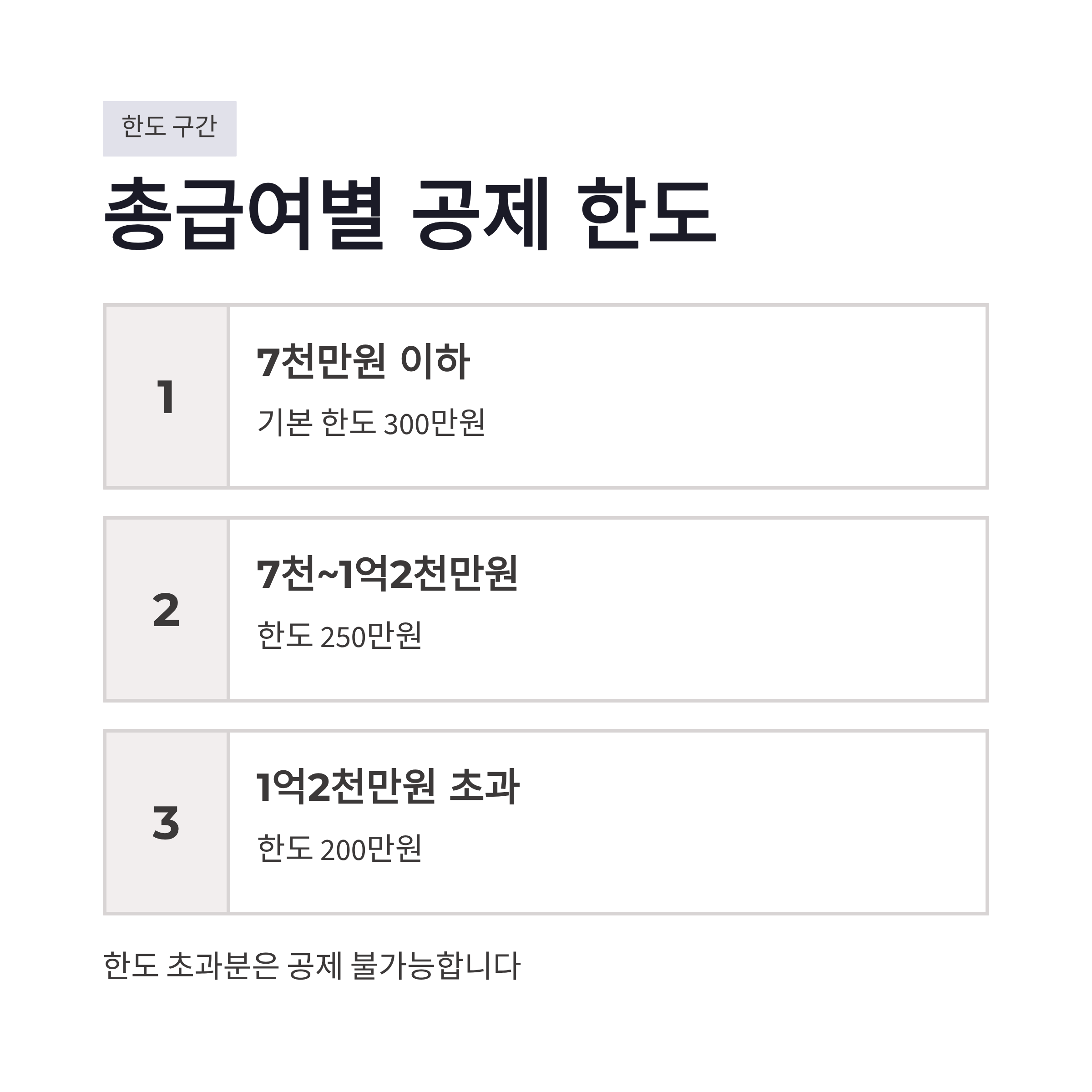 * 총급여 7천만원 이하: 기본 한도 300만원 * 7천만원~1억2천만원: 250만원 * 1억2천만원 초과: 200만원