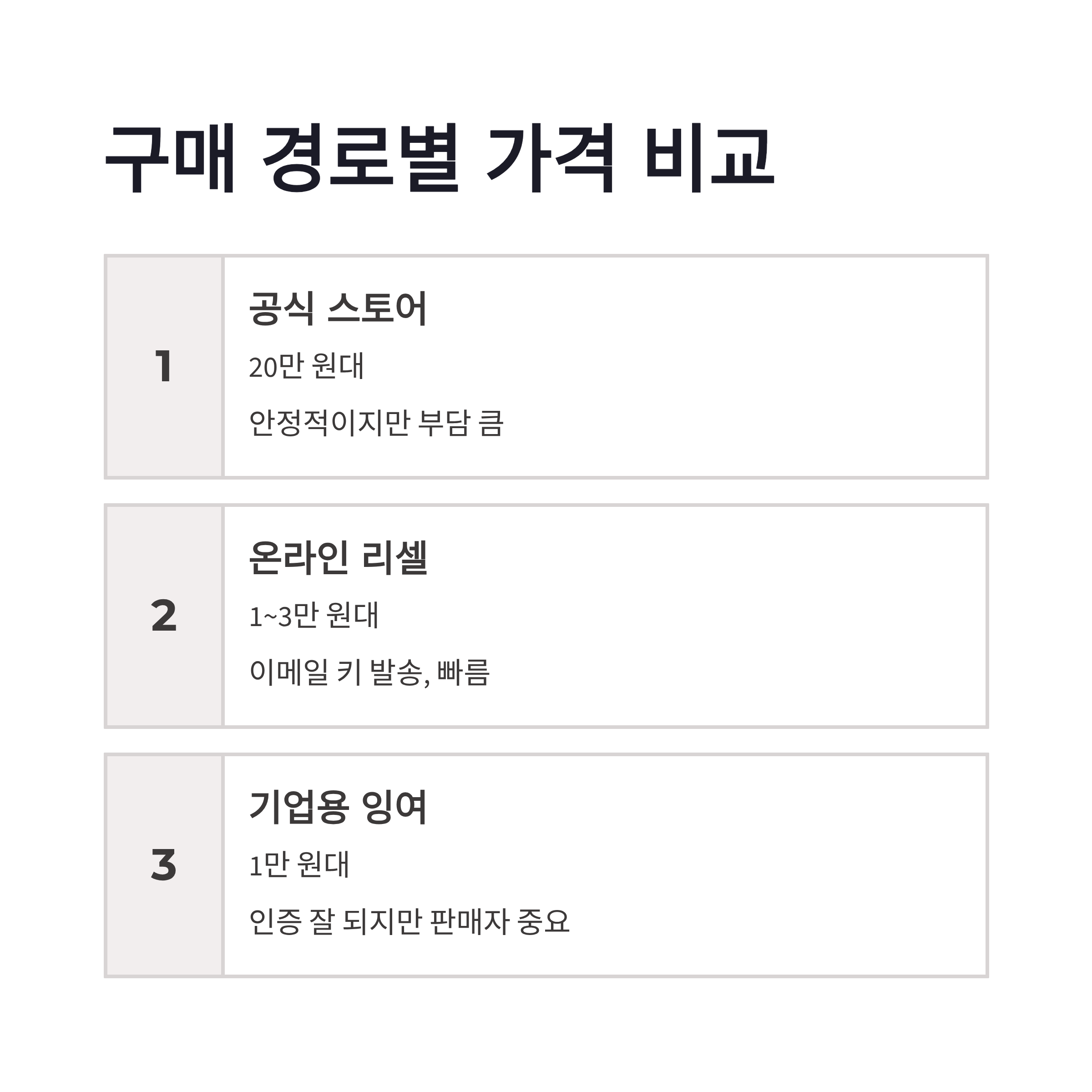 | 기업용 잉여 라이선스 | 1만 원대 | 인증 잘 되지만 판매자 중요 |