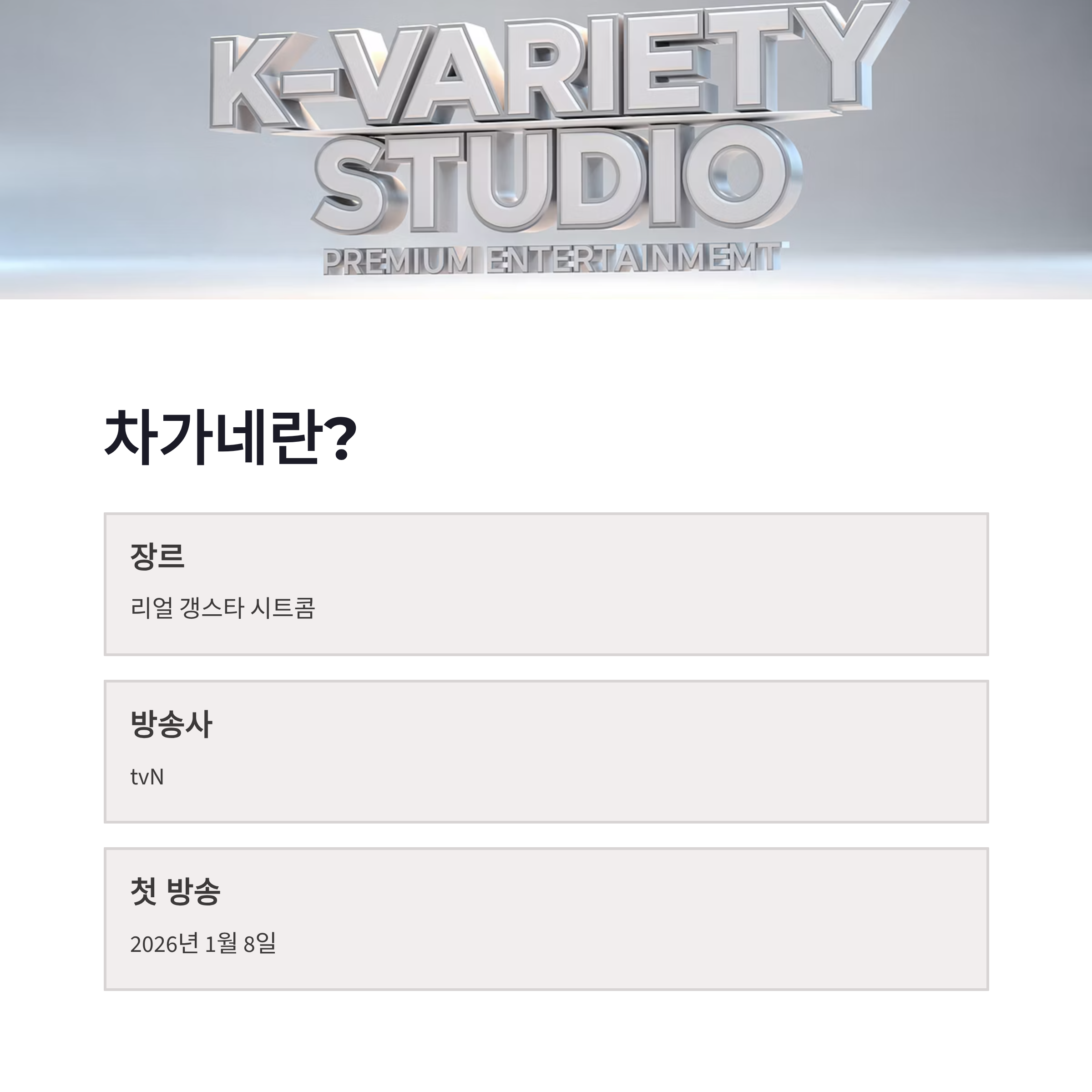 #차가네 #차가네기본정보 #차가네출연진 #차가네OTT #tvN예능 #2026예능 #리얼시트콤 #요즘예능추천 #차가네방송시간 #차가네다시보기 #티빙예능 #목요일예능 #신작예능 #예능추천 #한국예능