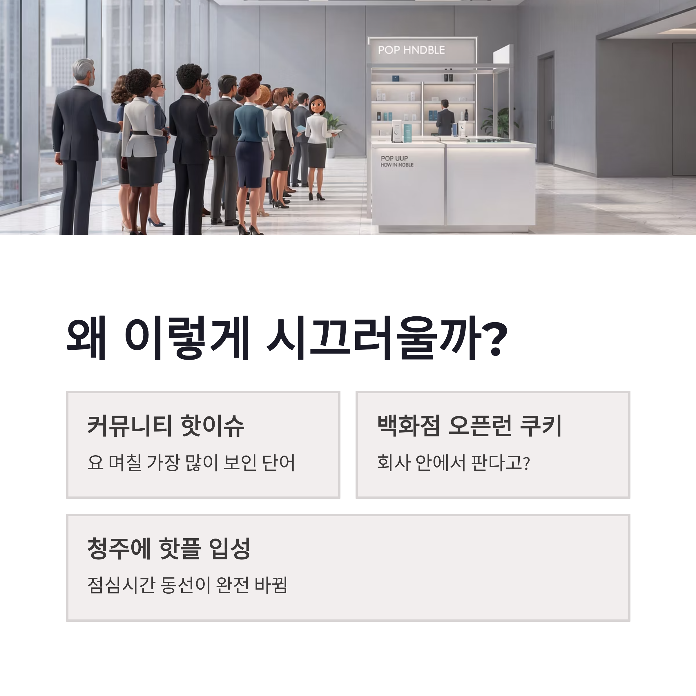 요 며칠 사이 커뮤니티에서 제일 많이 보인 단어가 뭔지 아시나요. 바로 두바이 쫀득 쿠키 팝업이었어요. 처음엔 “쿠키가 뭐라고?” 싶었는데, 내용을 보니 고개가 끄덕여지더라구요. 백화점 오픈런 해야 겨우 맛본다는 그 쿠키를 회사 안에서 판다? 그것도 청주에서요. 장소는 다름 아닌 SK하이닉스 사내. 직원들 말로는 “회사 안에 핫플이 들어온 느낌”이라는데, 이 표현이 딱이었슴다. 두바이 쫀득 쿠키 팝업 하나로 점심시간 동선이 완전 바뀌었다는 말도 나왔구요.