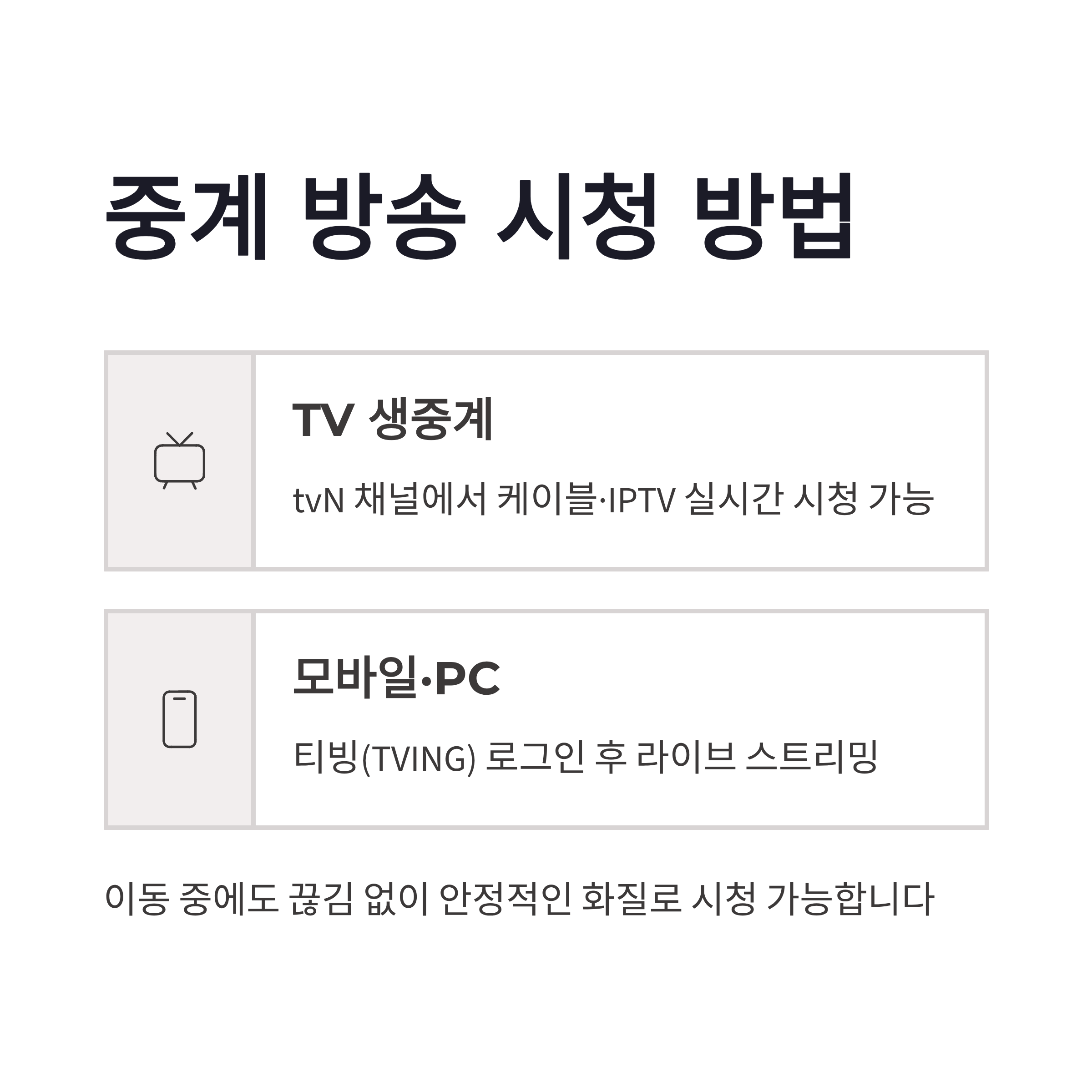 | TV 생중계 | tvN | 케이블·IPTV 실시간 시청 |