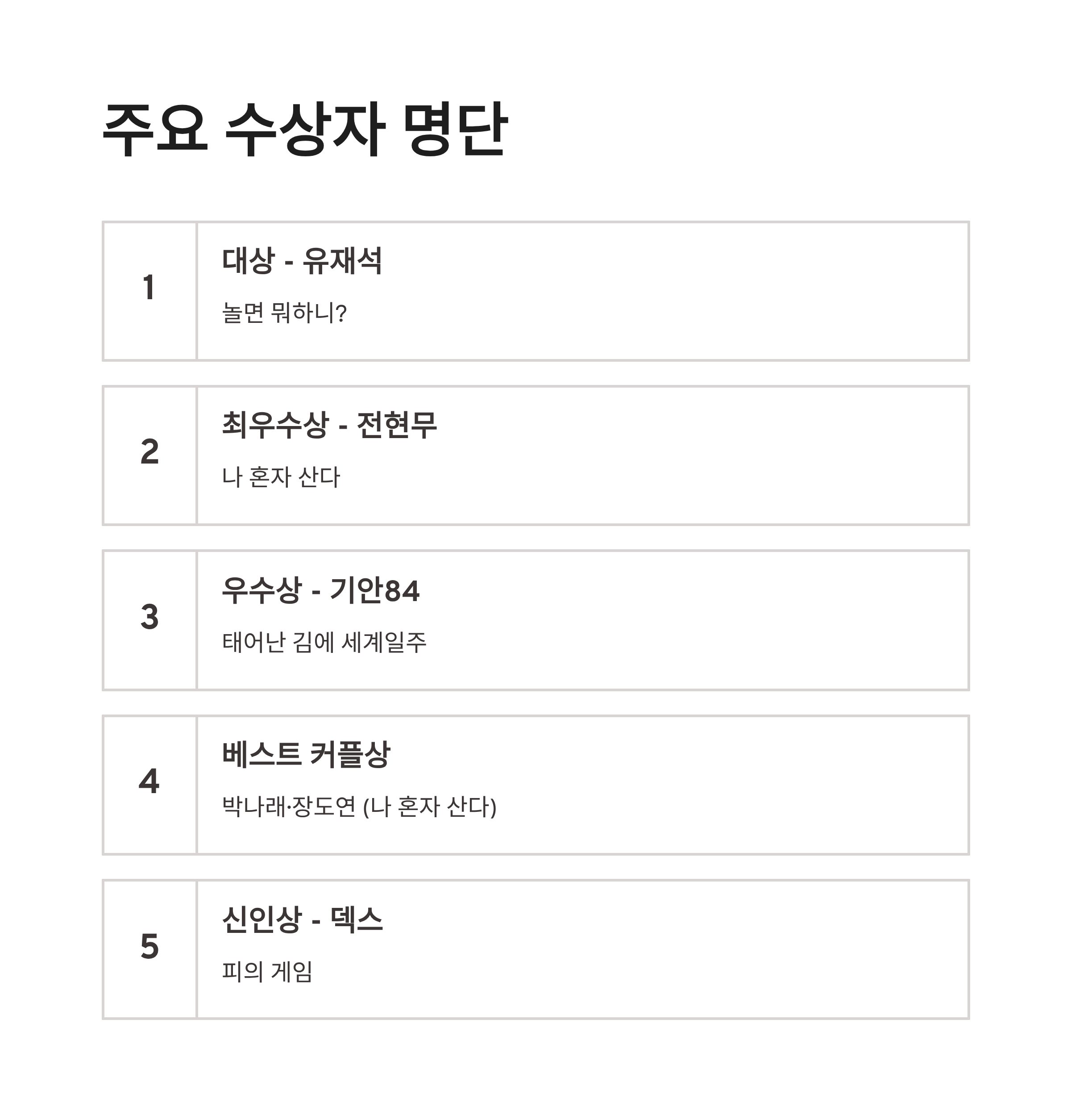 | 베스트 커플상 | 박나래·장도연 | 나 혼자 산다 |