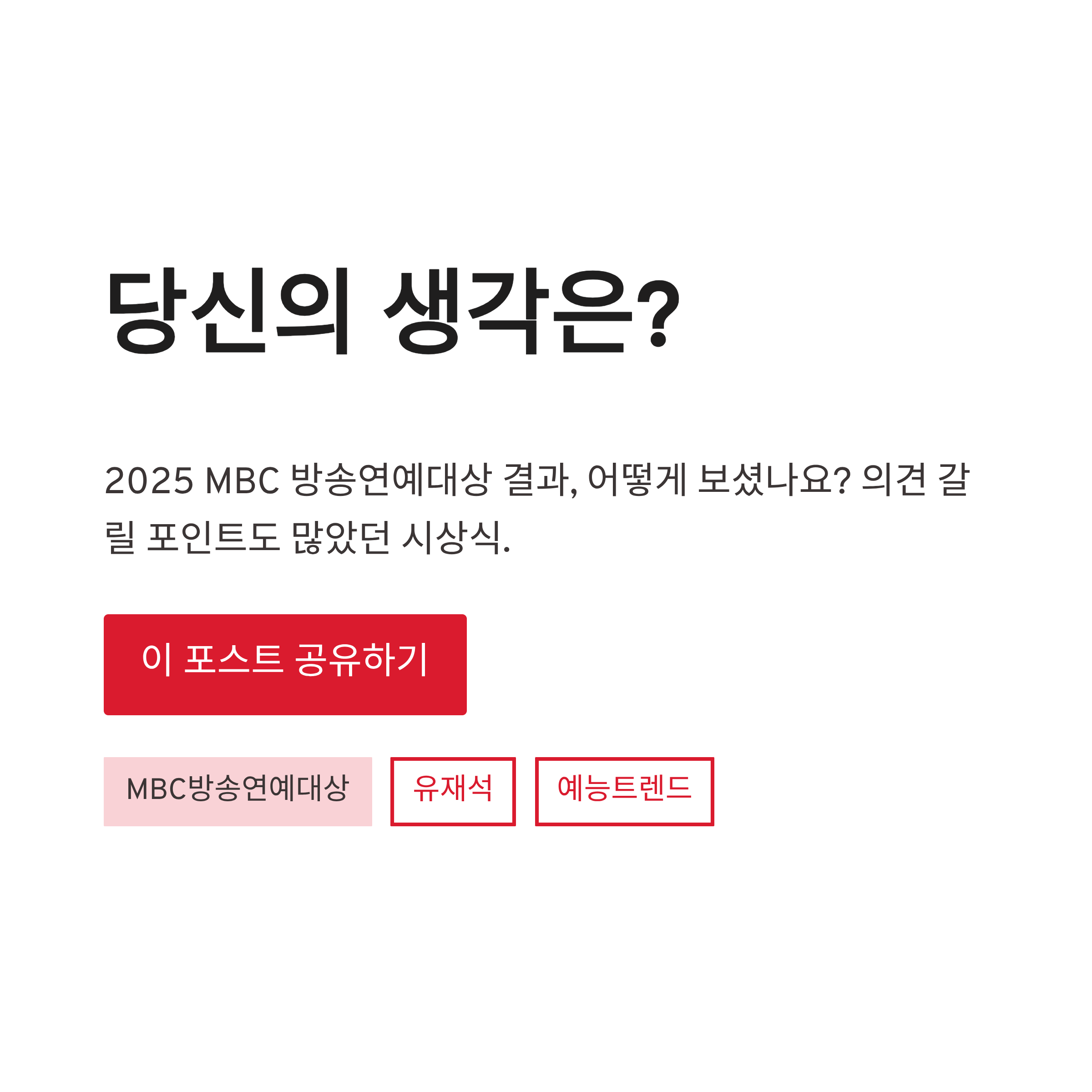 앞으로 MBC 예능이 어떤 방향으로 갈지, 벌써부터 좀 궁금해지네요. 여러분은 이번 MBC 방송연예대상 결과, 어떻게 보셨나요? 은근히 의견 갈릴 포인트도 많았던 것 같은데요 ㅎㅎ