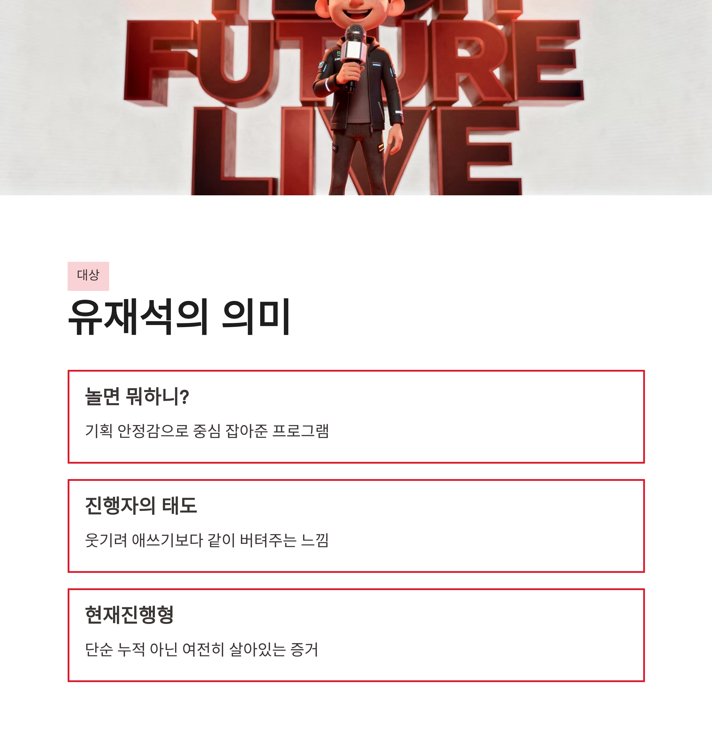 장점이라면 시청자가 더 깊게 몰입할 수 있다는 점, 단점은 초반 진입 장벽이 살짝 높다는 점 정도? 그래도 전체적으로는 건강한 방향 같았습니다. 그리고 확실한 건, 유재석 같은 중심축이 여전히 필요하다는 사실… 이건 부정 못 하겠더라구요.