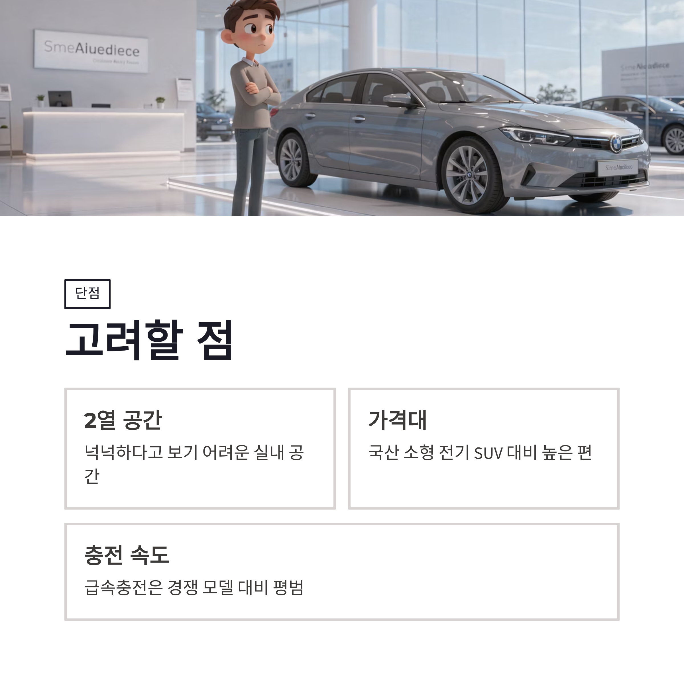 * 2열 공간은 넉넉하다고 보긴 어려움 * 가격이 국산 소형 전기 SUV보다 높은 편 * 급속충전 속도는 경쟁 모델 대비 평범