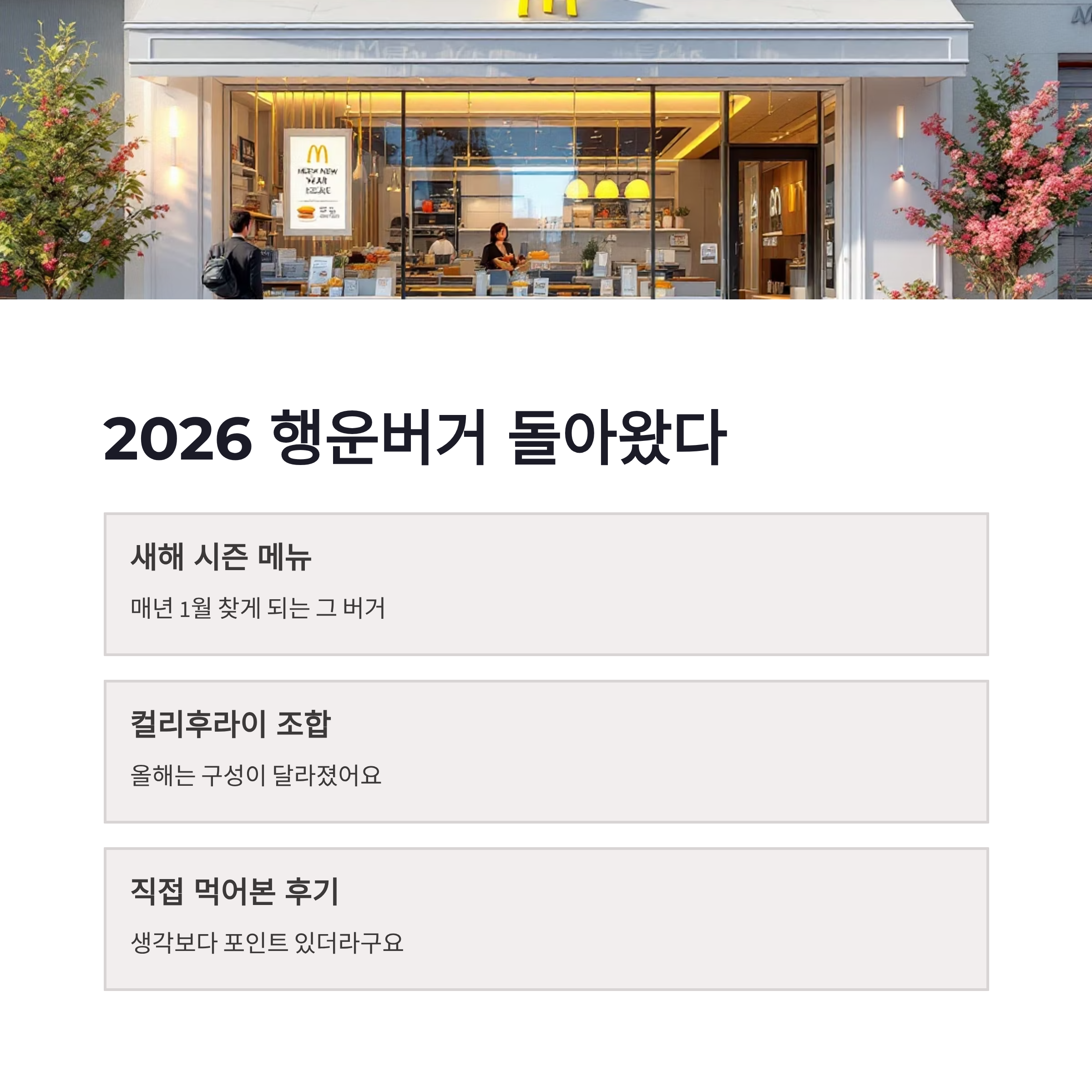 2026년 새해 시작하자마자 맥도날드 행운버거가 또 돌아왔습니다. 매년 이맘때만 되면 괜히 한 번은 먹어줘야 할 것 같은 그 메뉴요 ㅋㅋ 올해 행운버거는 컬리후라이랑 묶이면서 구성이 살짝 달라졌더라구요. 2026 행운버거 기준으로 메뉴 구성, 가격, 맛 차이까지 직접 먹어본 느낌으로 정리해봤습니다. 솔직히 말하면 작년이랑 비슷할 줄 알았는데, 생각보다 포인트가 있더라구요.