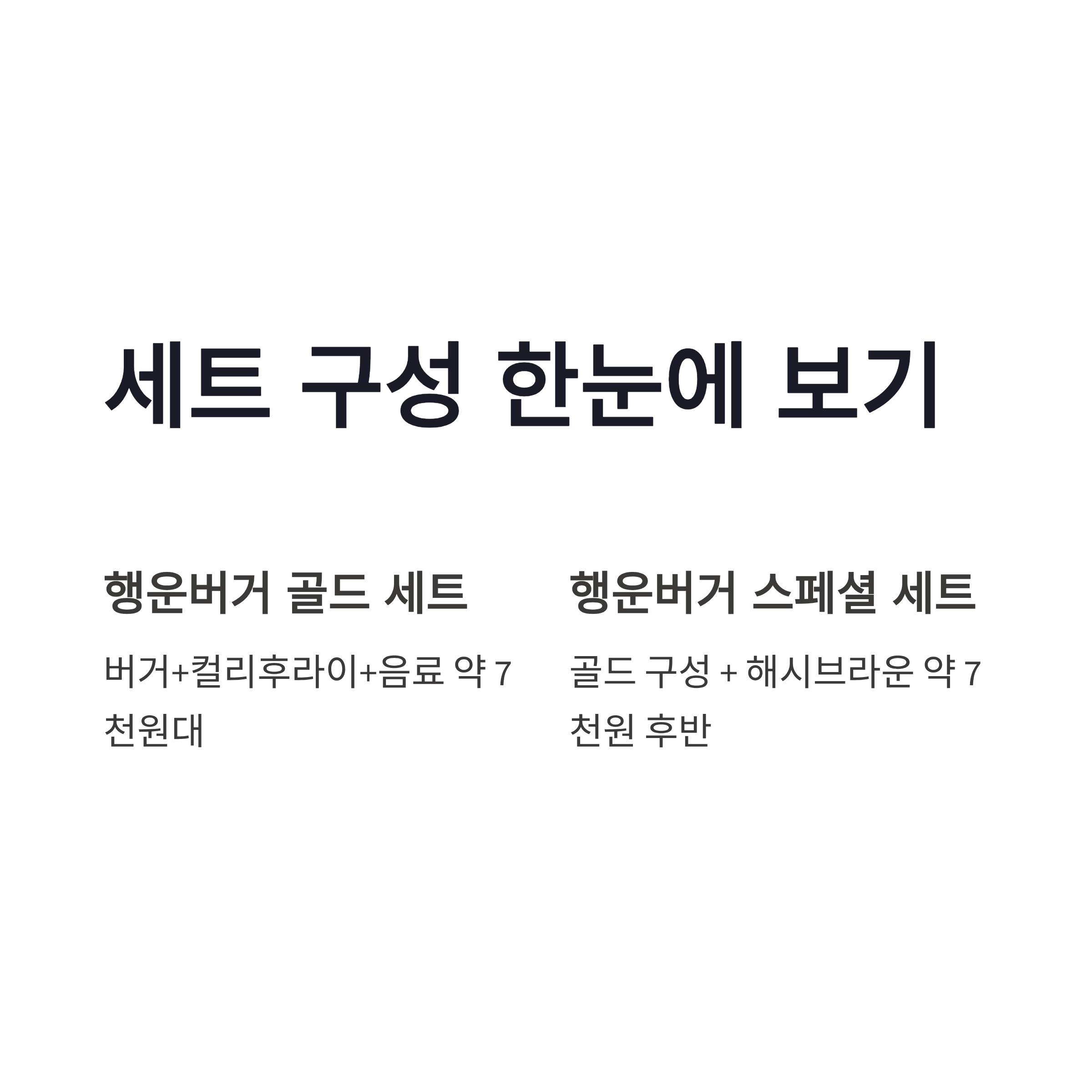 | 행운버거 스페셜 세트 | 골드 구성 + 해시브라운 | 약 7천원 후반 |