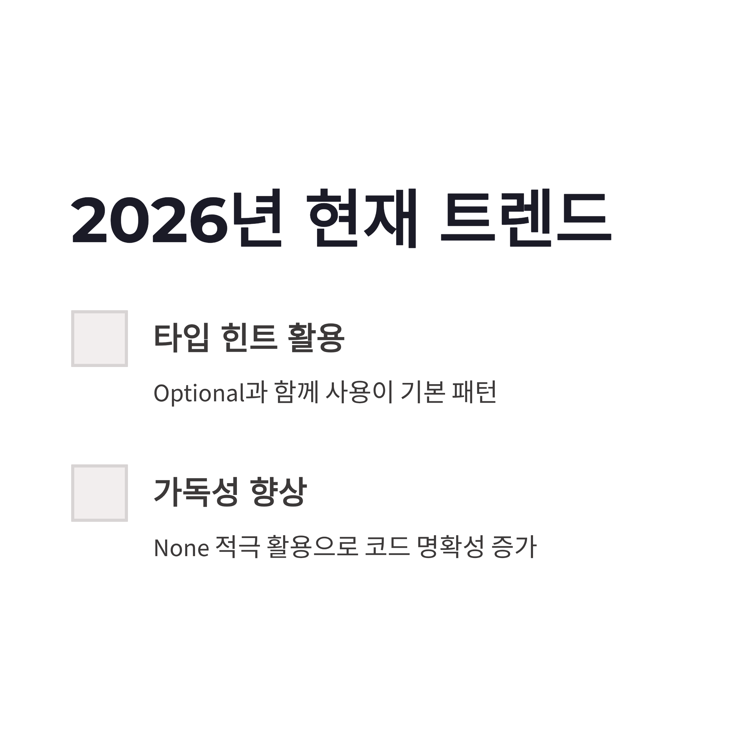 다른 언어에서 나오는 null이랑 Python의 None은 비슷해 보이지만 결은 좀 달라요. Python의 None은 객체라서 더 안전한 편입니다. 장점부터 보면, 명확하고 예측 가능하다는 점이 제일 큽니다. 예상 못한 null 에러로 터지는 경우가 확 줄어들어요. 반면 단점은, None 체크를 깜빡하면 TypeError가 날 수 있다는 점… 이건 진짜 많이 겪어봤습니다 ㅠㅠ 2026년 기준으로는 타입 힌트(Optional)랑 같이 쓰는 패턴도 거의 기본처럼 자리 잡았고, 코드 가독성 면에서는 None을 적극적으로 쓰는 쪽이 훨씬 깔끔하더라구요.