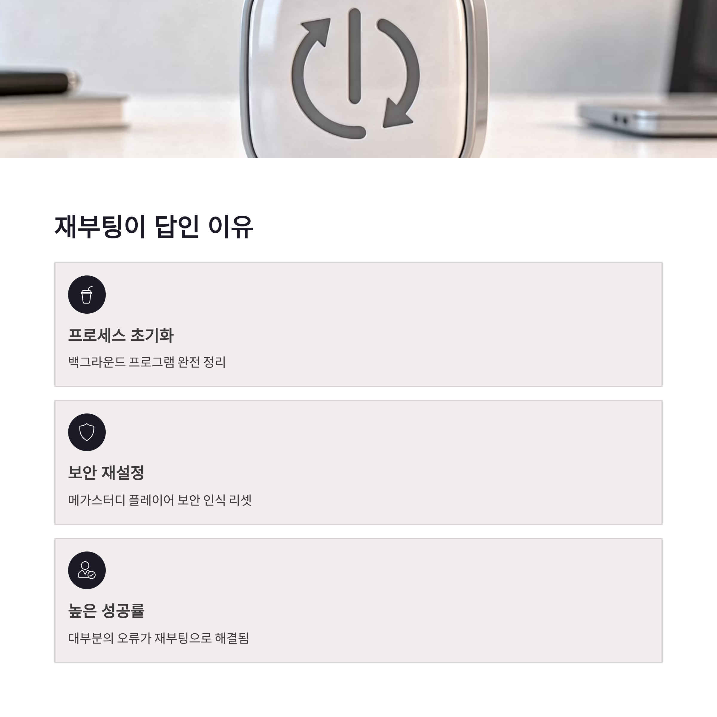 | 재부팅 | 강제 종료 후 재시작 | ★★★★☆ |