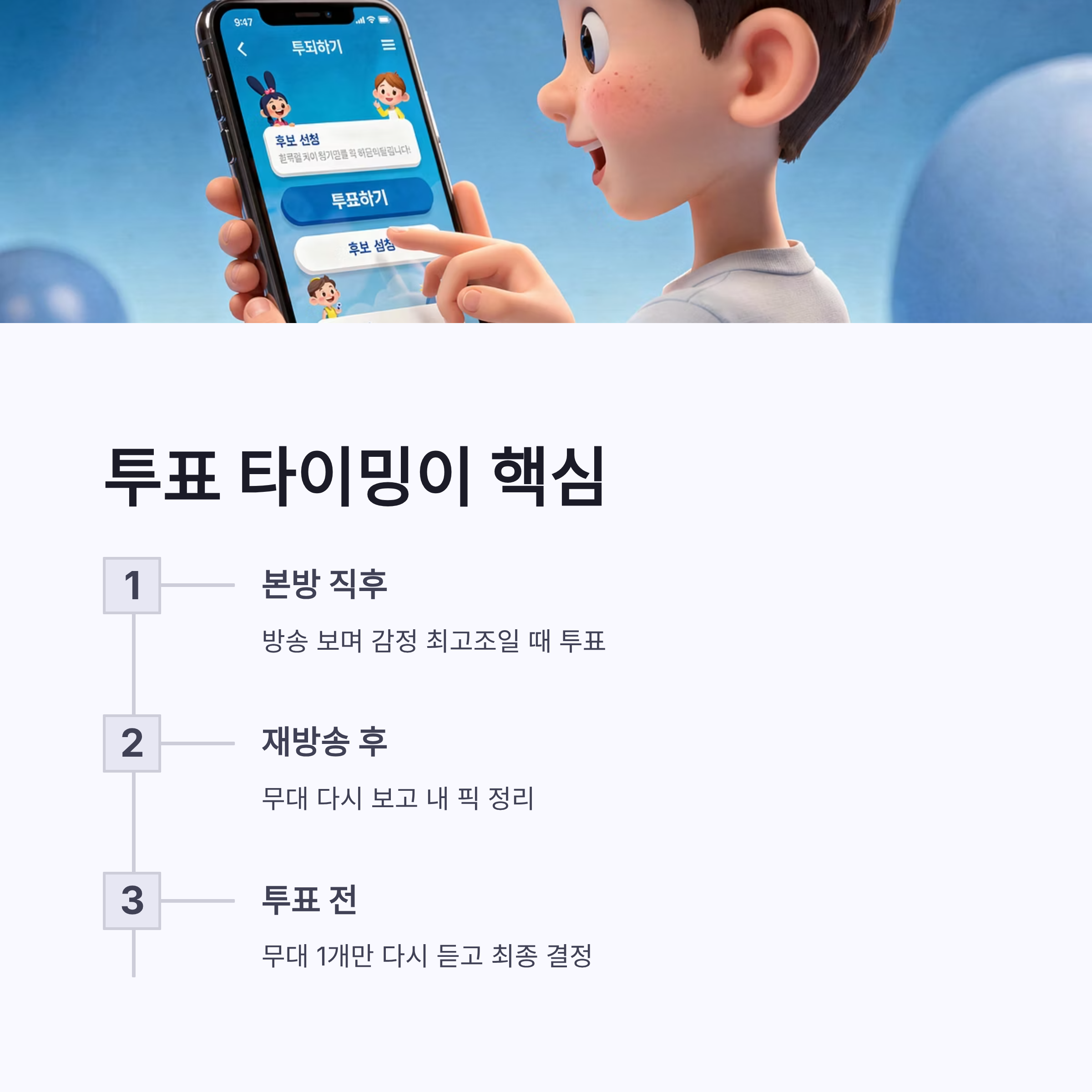 | 본방 시청 | 방송 직후 투표 화면 확인 → 바로 참여 | 감정 뜨거울 때 손이 빨라짐 ㅋㅋ |