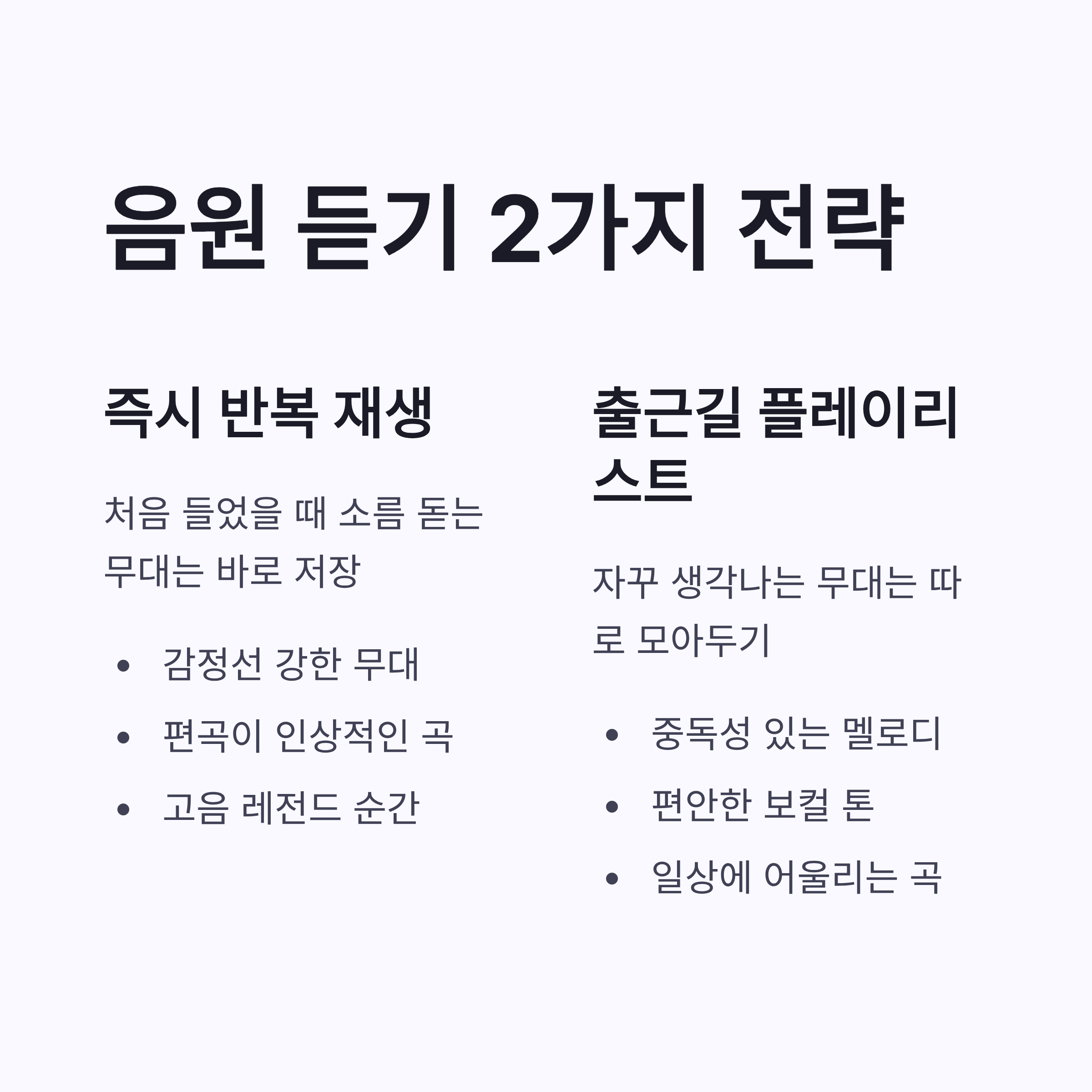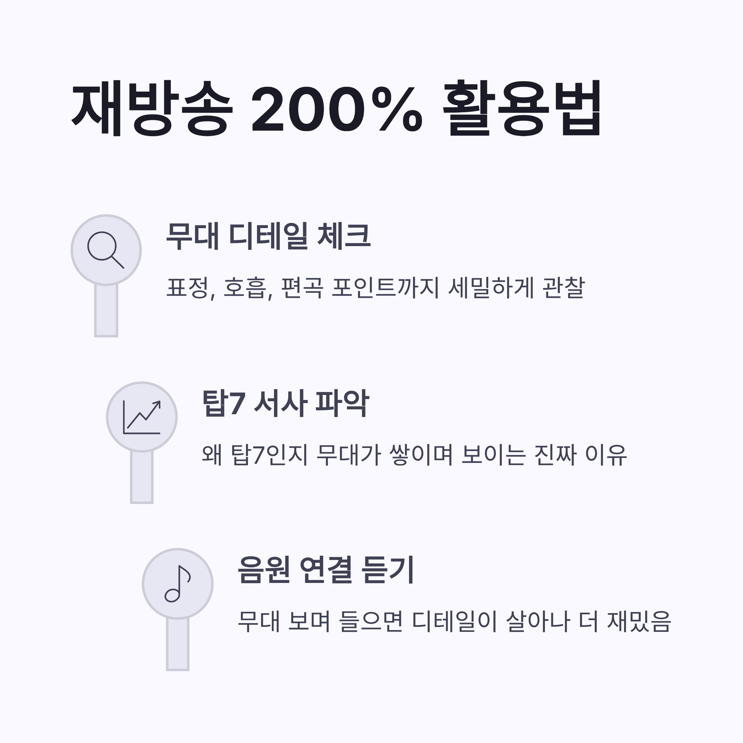 | 음원만 듣기 | 인상 깊은 번호 위주로 저장 → 출근길 재생 | 무대 표정이 자동 재생됨… |