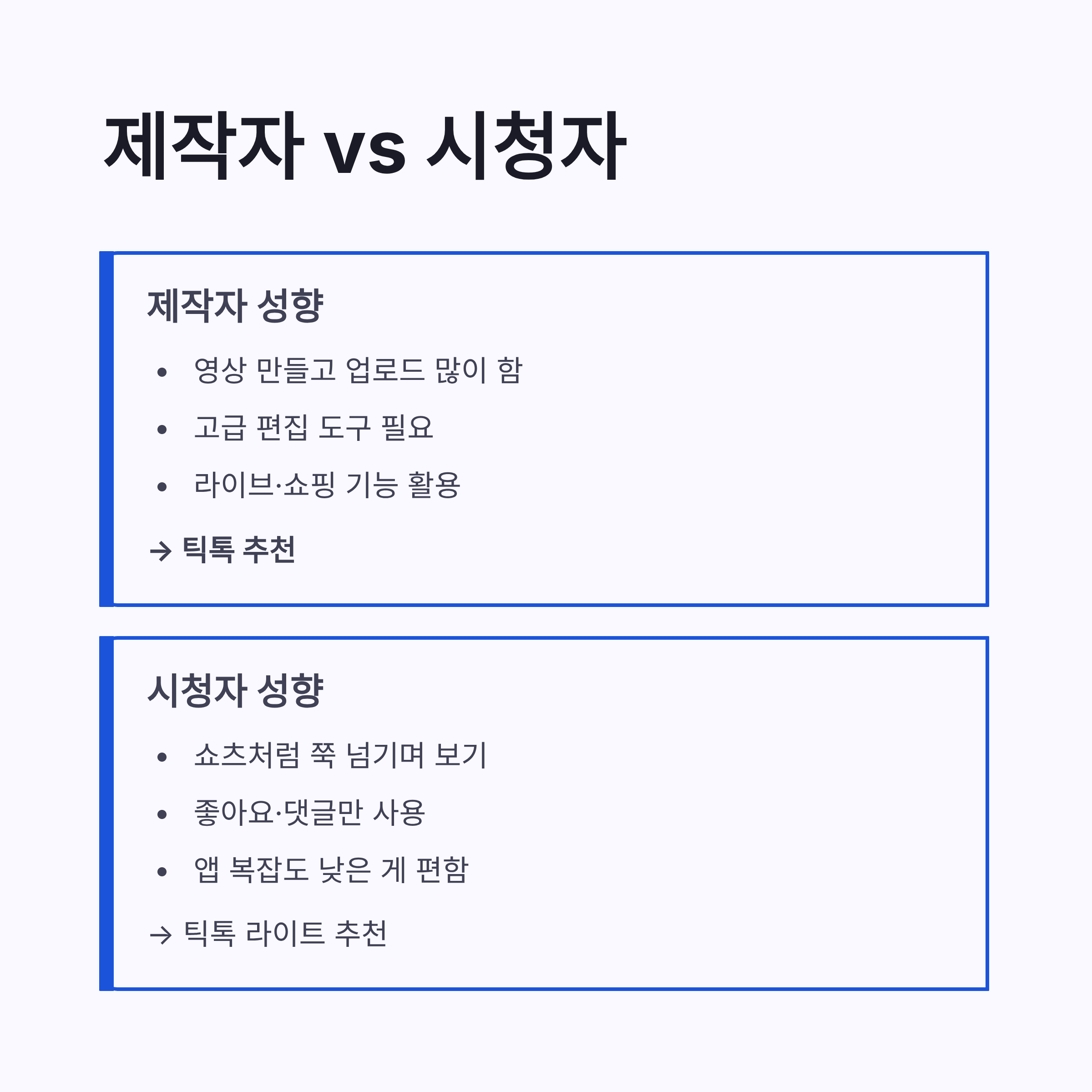 여기서 딱 갈려요. 틱톡은 촬영, 편집, 필터, 템플릿, 라이브, 쇼핑/홍보 기능까지 “올인원” 성격이 강하잖아요. 그래서 영상 만드는 사람(업로드 많이 하는 사람)은 틱톡이 편해요. 반대로 틱톡 라이트는 시청과 기본 반응(좋아요/댓글) 중심이라, 고급 편집 도구나 라이브 관련 기능이 제한적으로 느껴질 수 있어요. 대신 앱이 덜 복잡해서 “그냥 쇼츠처럼 쭉 넘기면서 보기”엔 틱톡 라이트가 더 편하더라구요. 정리하면, 제작자 성향이면 틱톡 / 시청자 성향이면 틱톡 라이트 쪽으로 마음이 기울 확률이 높아요.