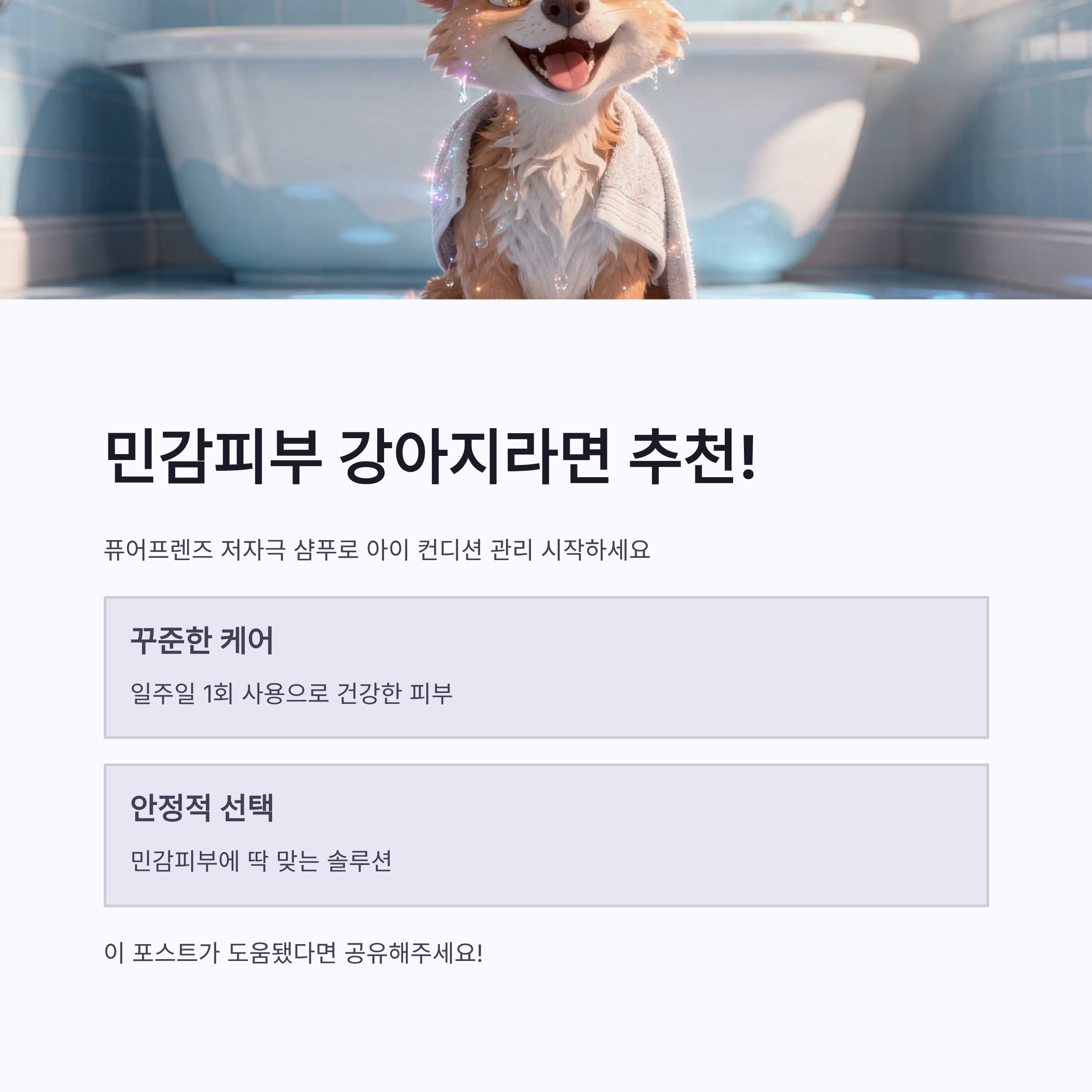 결론적으로 퓨어프렌즈 저자극 강아지샴푸는 목욕 시간을 전쟁에서 일상으로 바꿔준 제품이었어요. 씻기고 나서 긁는 모습이 줄고, 털 만질 때 촉감도 달라졌구요. 보호자인 저도 스트레스가 확 줄었습니다. 민감피부 강아지라면 한 번쯤 써볼 만한 선택지라고 느꼈어요. 꾸준히 쓰면서 아이 컨디션 관리하기 딱 좋았습니다.