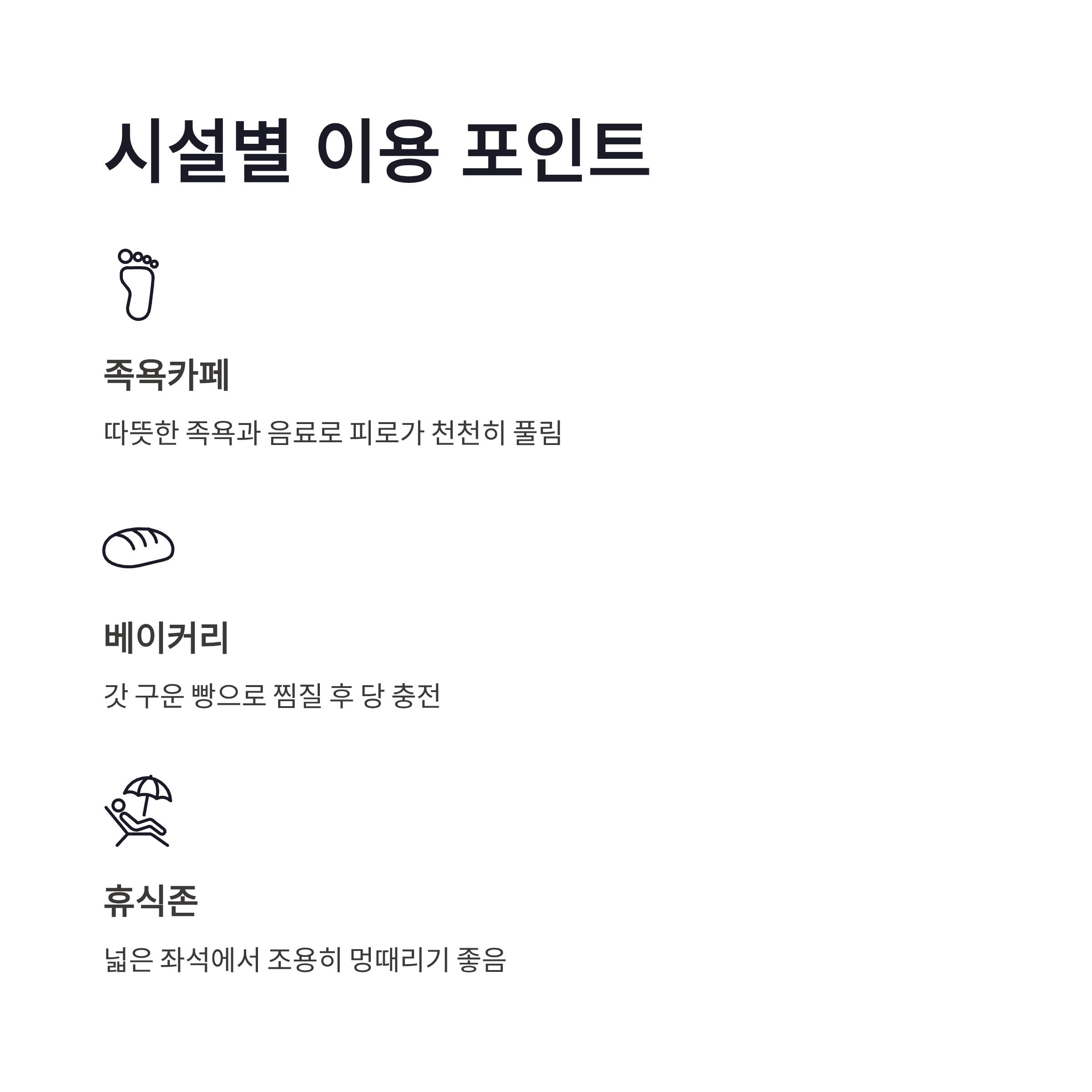 | 족욕카페 | 따뜻한 족욕 + 음료 | 피로가 천천히 풀림 |